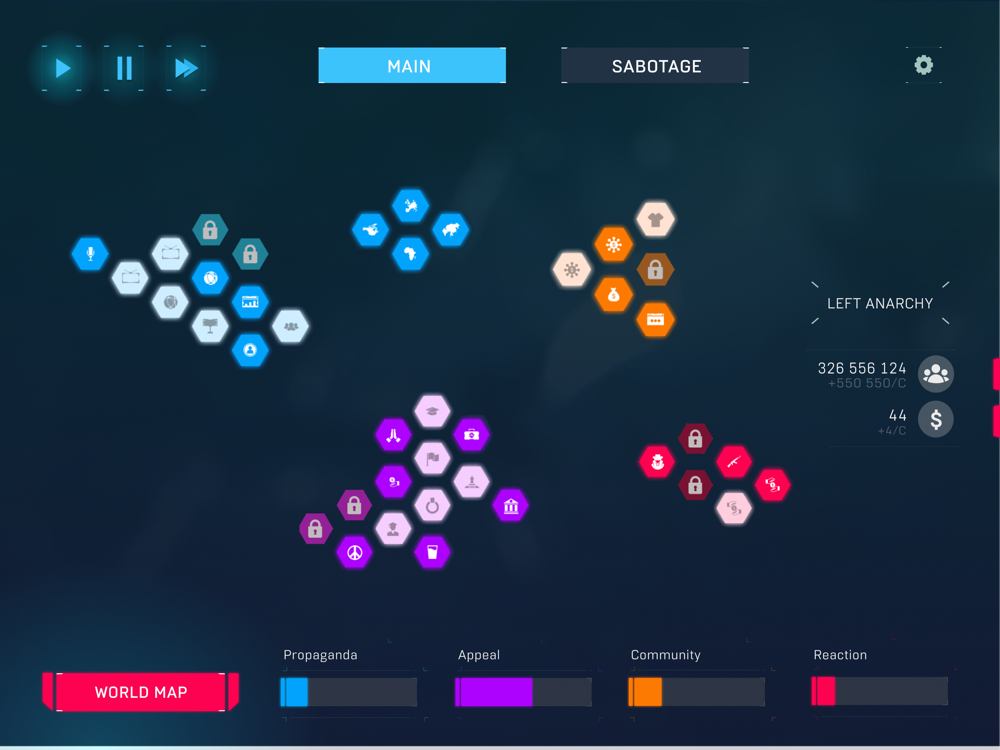 The game features 8 fictional political ideologies: Communism, Capitalism, Imperialism, Anarchy, Libertarianism, Ecologism, Militarism, Pacifism. Each ideology has unique upgrades, game mechanics, and expansion features.