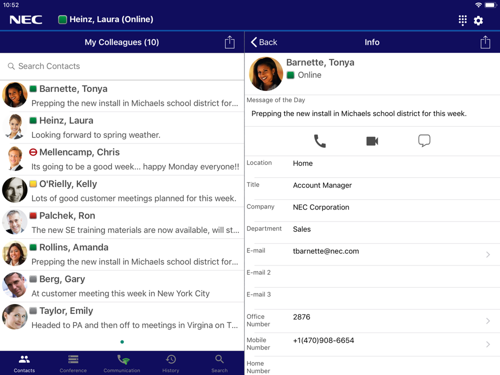 The UNIVERGE 3C Mobile Client Plus provides control over communications to and from any VoIP phone on your system that is assigned to you, including a desk phone in your office, a soft phone running on your PC or any smartphone or tablet device, a shared phone you are temporarily logged in to, etc. With the UNIVERGE 3C Mobile Client Plus you can place outbound calls from any VoIP device assigned to you, with the ability to screen calls, answer calls, send calls directly to voice mail, or redirect inbound calls to any of your devices, including your tablet or smartphone. The UNIVERGE 3C Mobile Client Plus provides a real time notification and you cantake immediate action on the call.