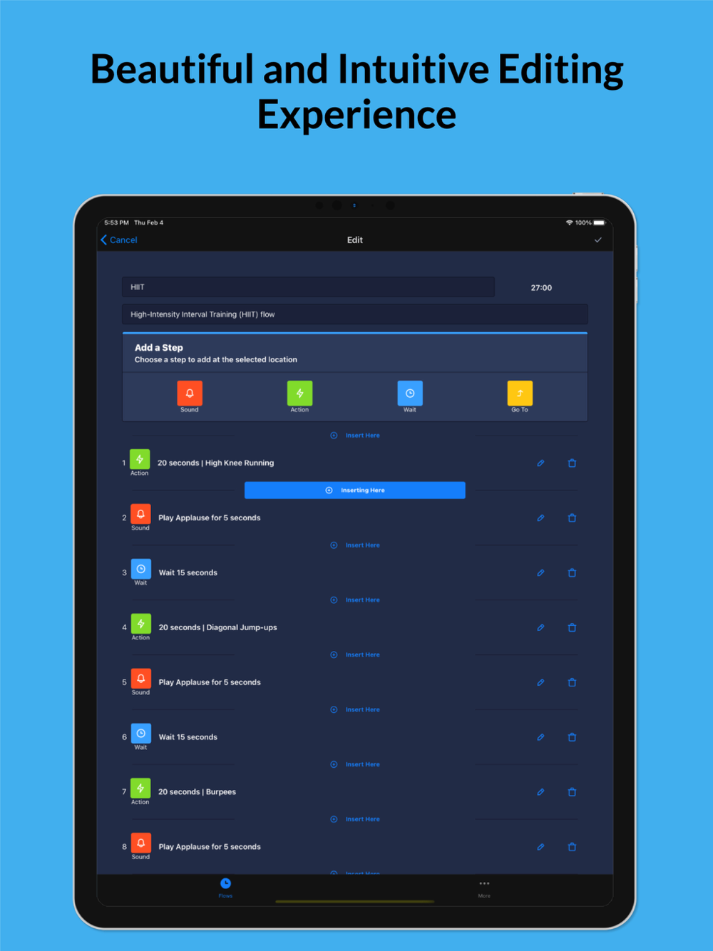This app provides a fascinatingly simple and intuitive editor for setting up your own custom timers. With just a few building blocks you can start creating the exact experience you want.