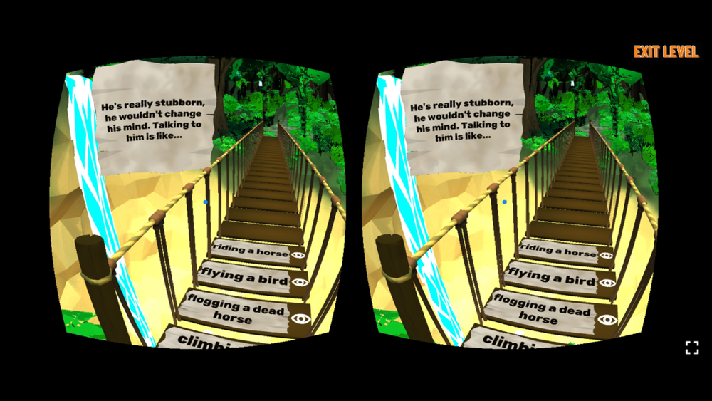 Can you reach the other side of the chasm? Answer 10 multiple-choice questions by selecting the only correct plank with your gaze. But don’t pick the wrong answer, or you’ll fall off the bridge – except in fear-of-heights mode, where the bridge spans a calmly floating river. Every game over is an opportunity to learn, and you can always try again. Crossing the bridge successfully takes about 10 minutes.