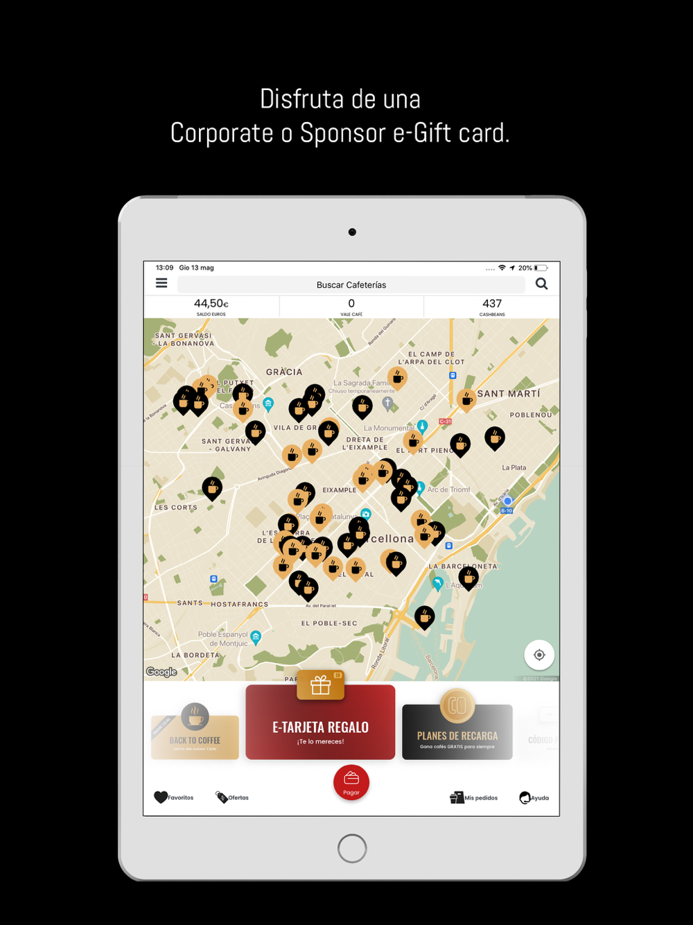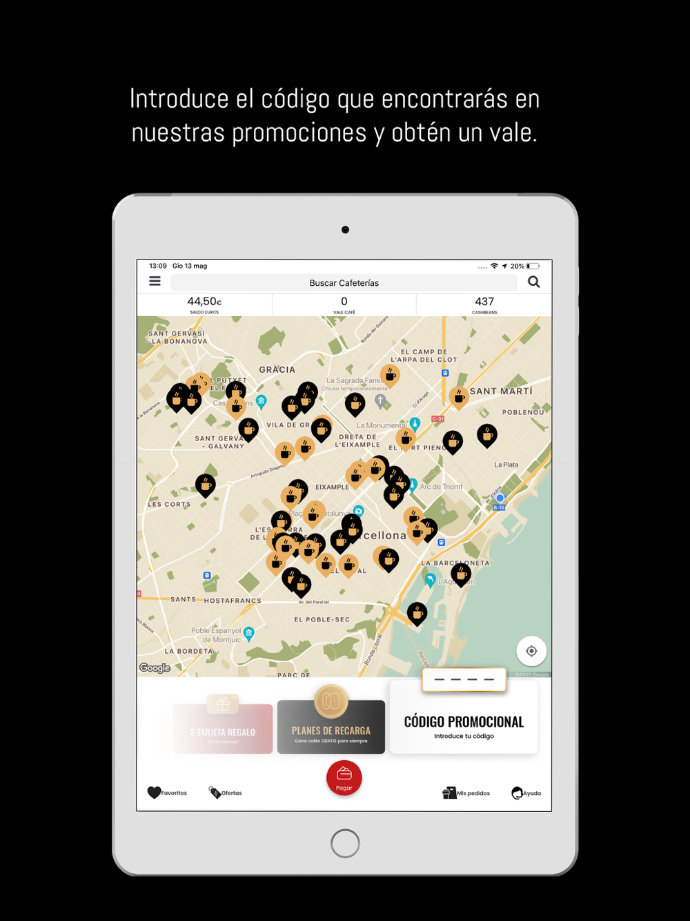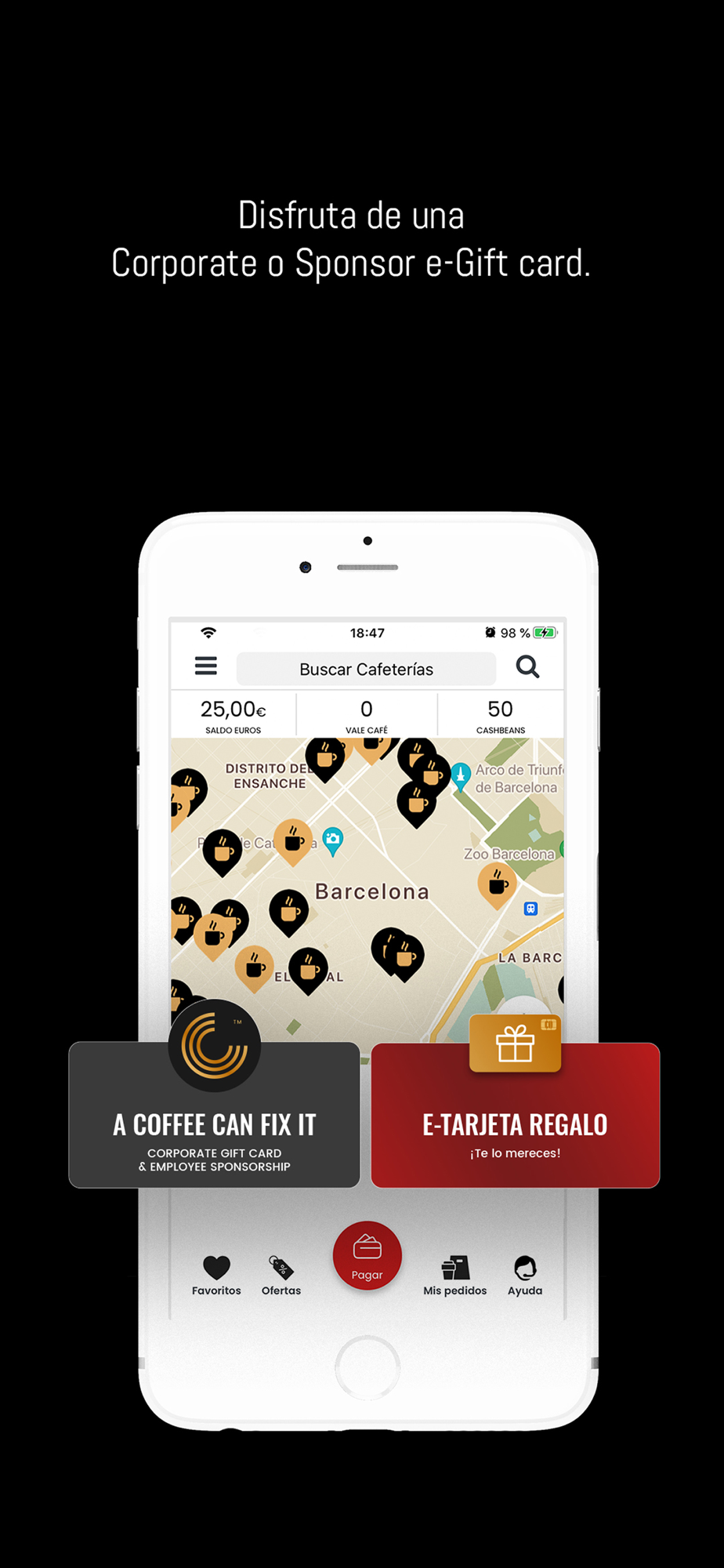Desde Coffeecard entendemos que a veces necesites tu café y lo necesites en el momento. Por eso, la aplicación te muestra las cafeterías cerca de ti para una dosis de cafeína rápida y de calidad.