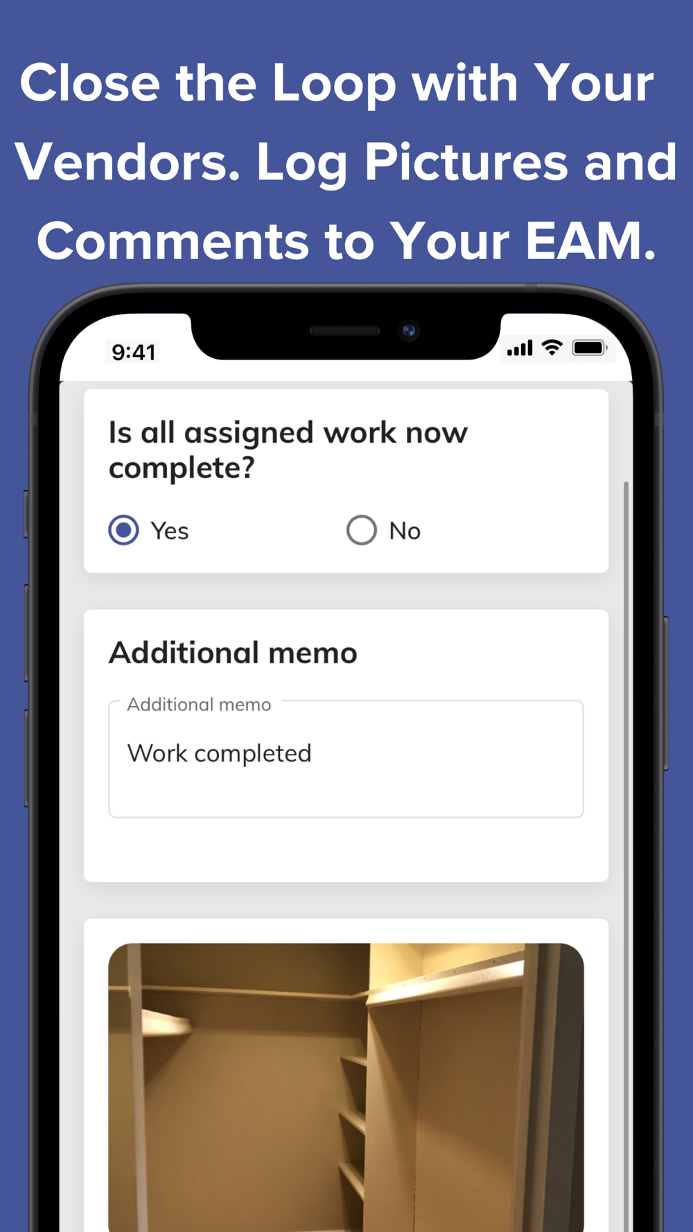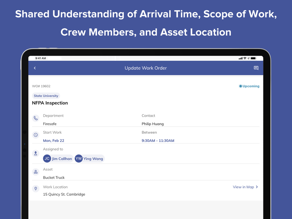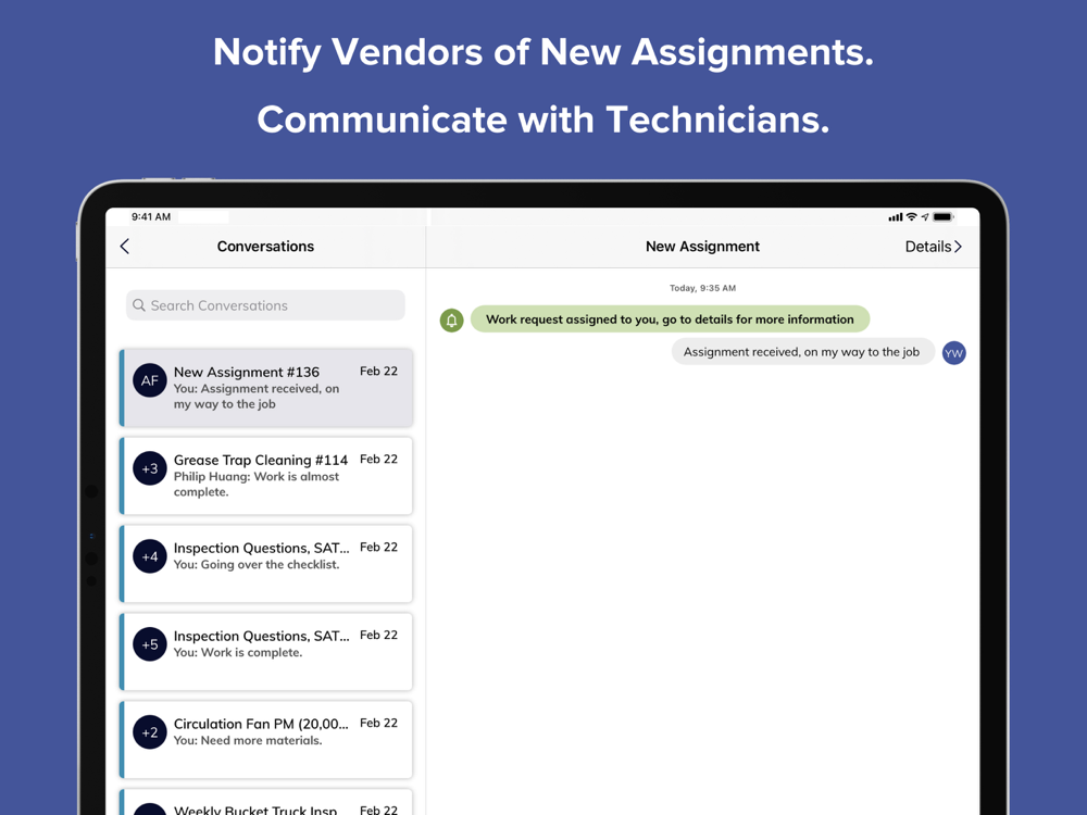 Maintain real-time awareness of when a work request is reviewed, accepted, modified, confirmed, and assigned. Know when the technician arrives on-site, when work status changes, and when the task is completed. All task details are captured for your EAM system, and can be viewed in the app by you and your vendor at any time.