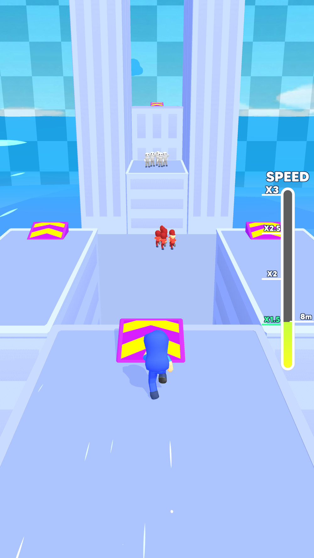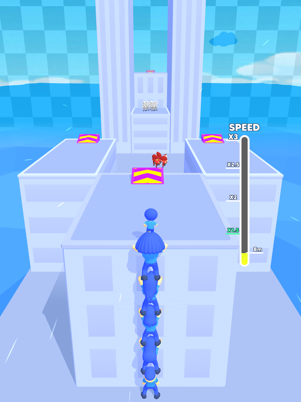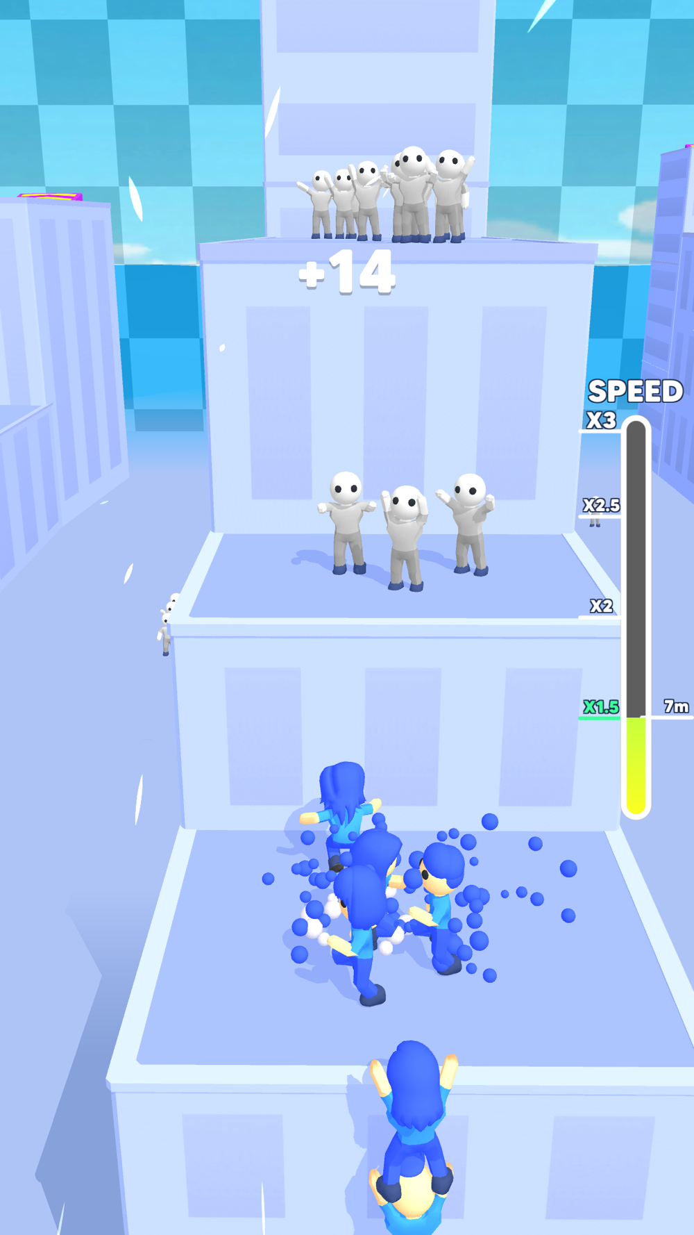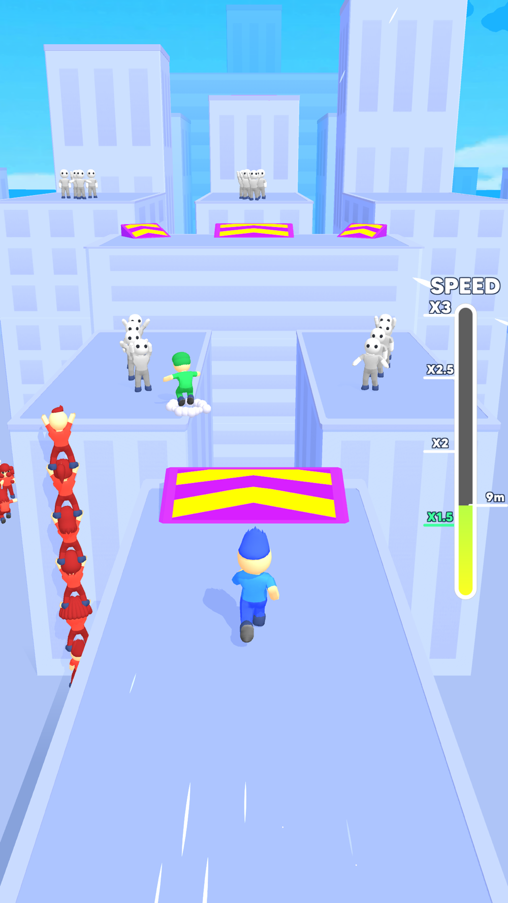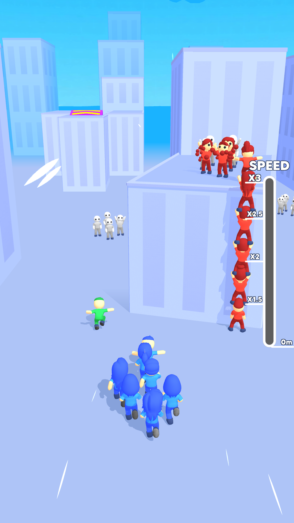 Collect your crowd and use them to stack up buildings, the higher you can get the faster you will get!