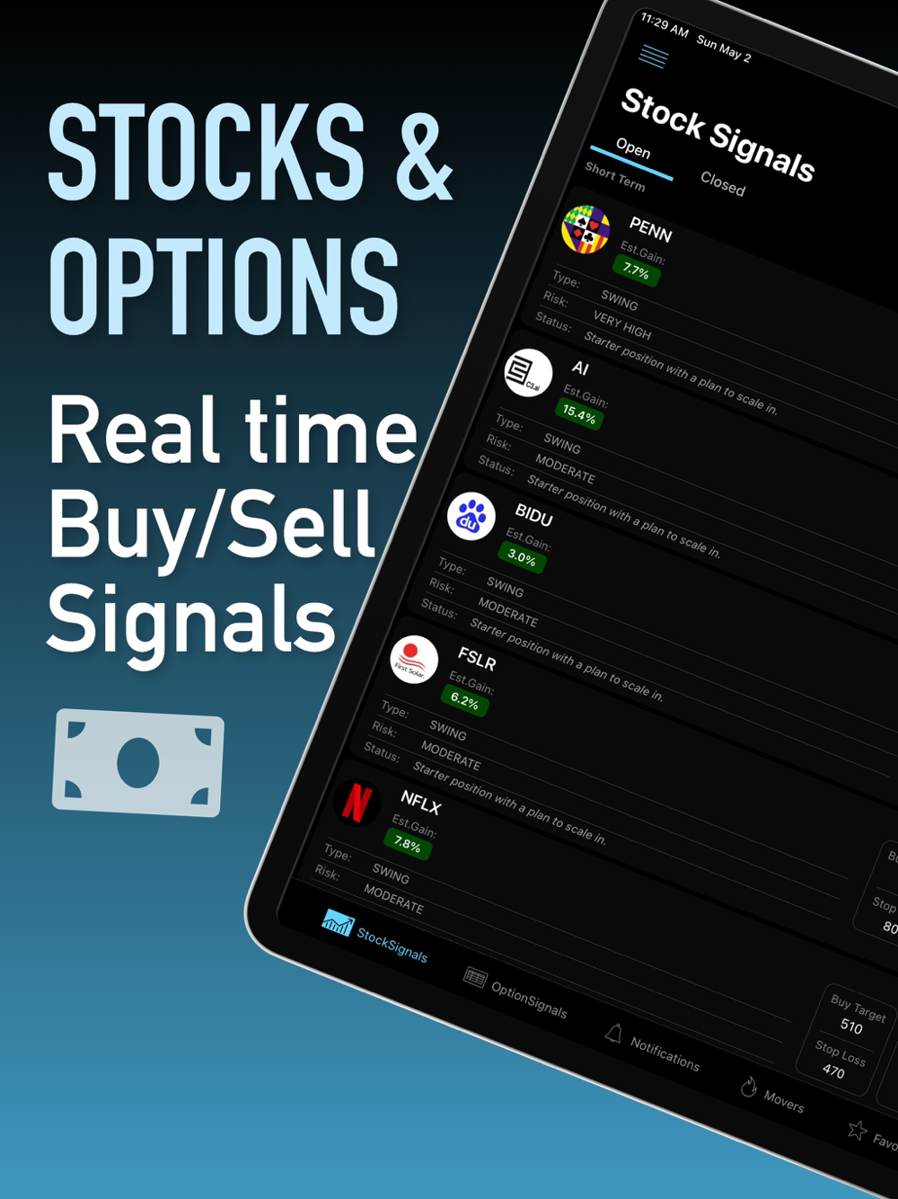 Trade Signals App sends real time push notification signals to find what Stock/Option to buy , when to buy and at what price, when to sell and at what price.