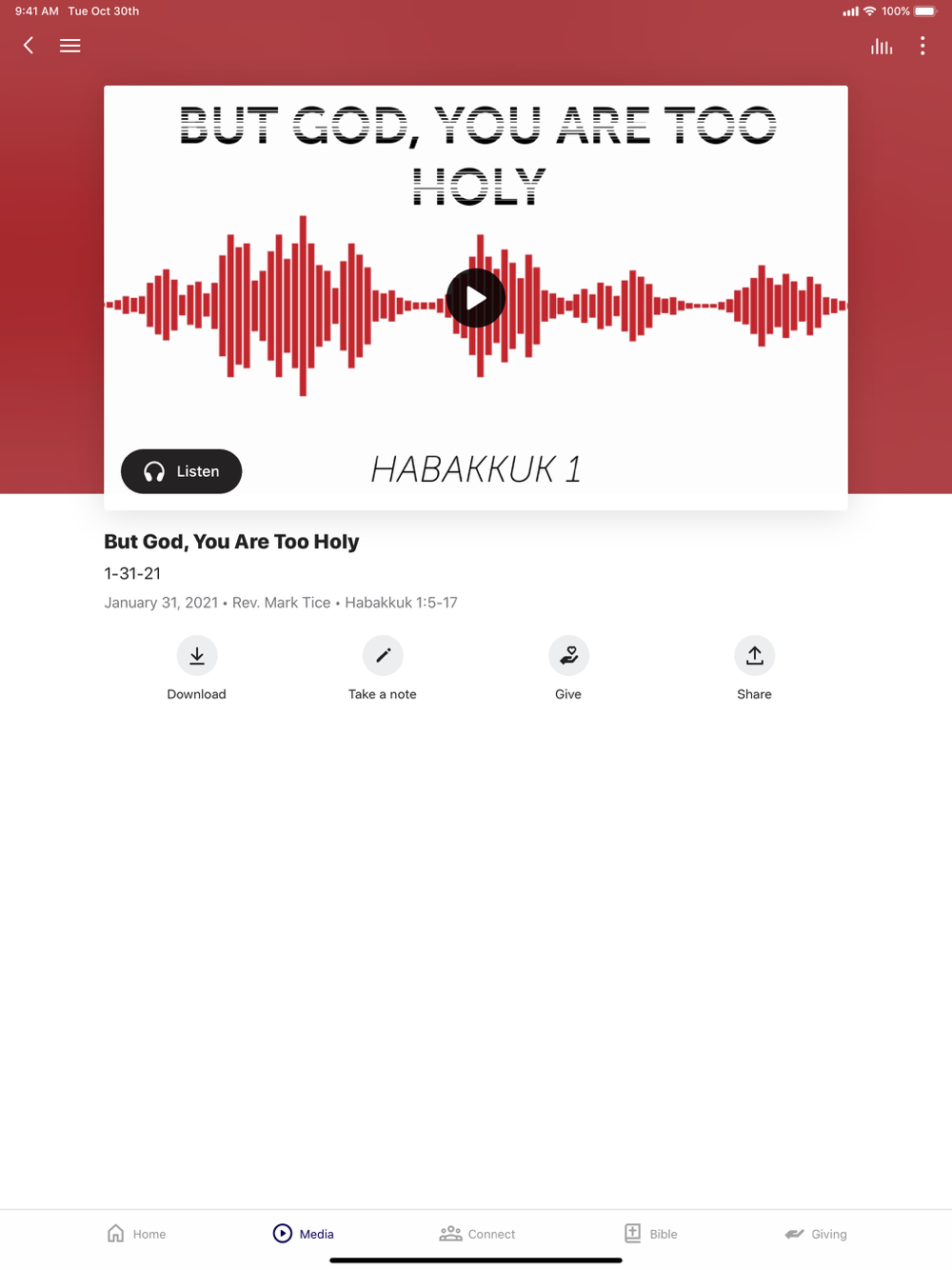 This app will help you stay connected with the day-to-day life of our church. With this app you can: watch or listen to past messages; stay up to date with push notifications; share your favorite messages via Facebook, or email; and download messages for offline listening.