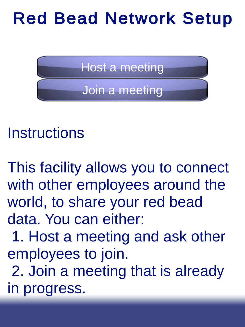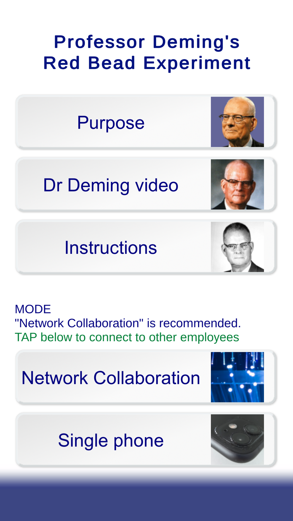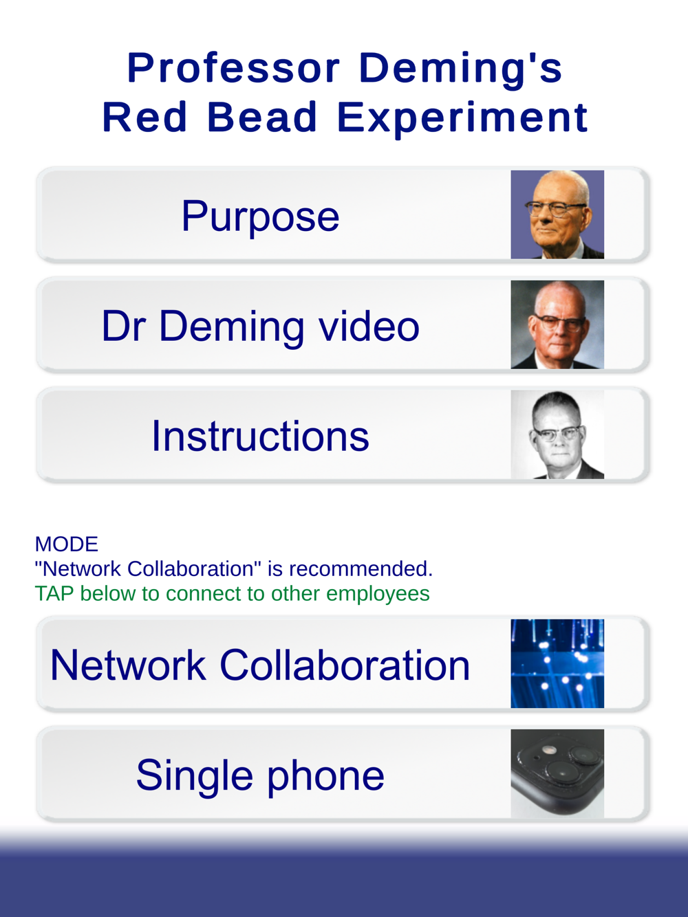 The app includes powerful, built-in, one touch, multiuser networking. This allows a remote meeting of a group of people to carry out the Red Bead Experiment, at simultaneous locations across a company, or across the world. This is the ideal non contact, distance learning.