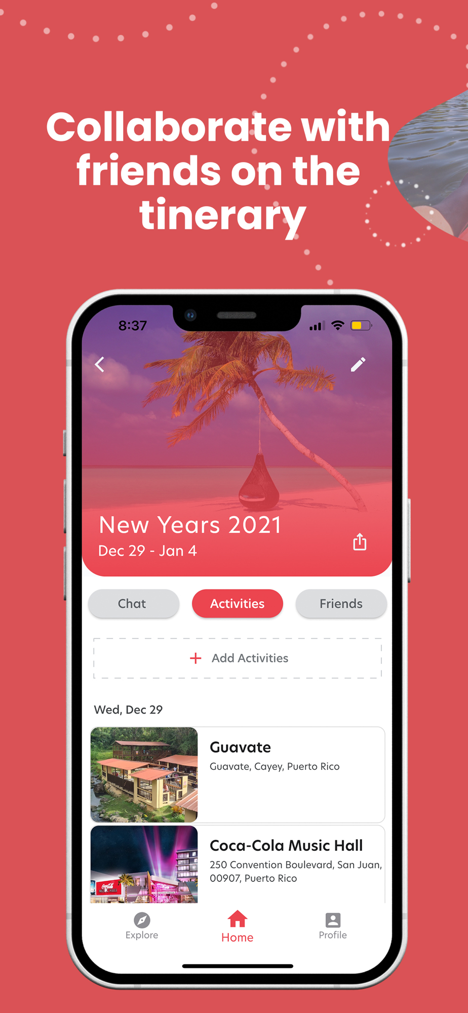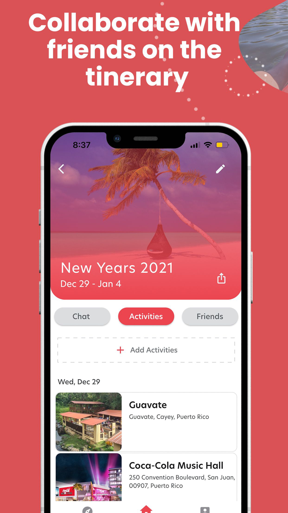 * Allows friends to add and remove trip activities to promote a collaborative environment