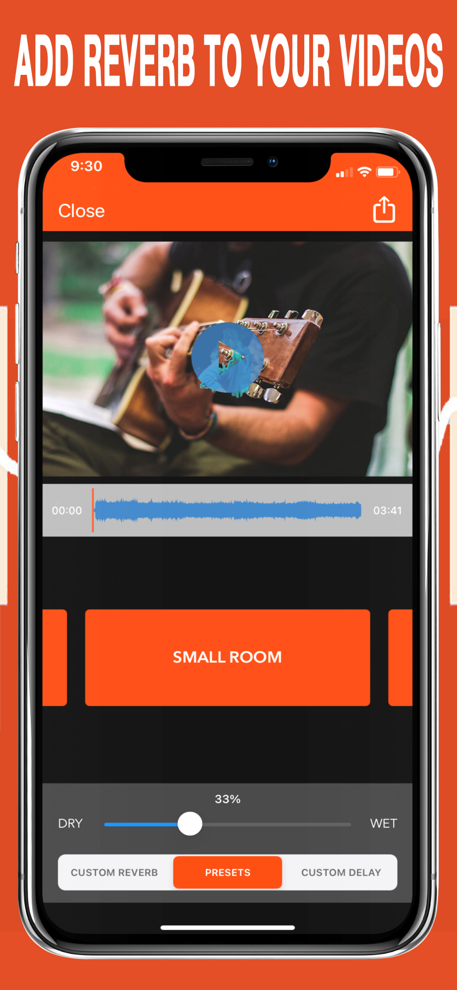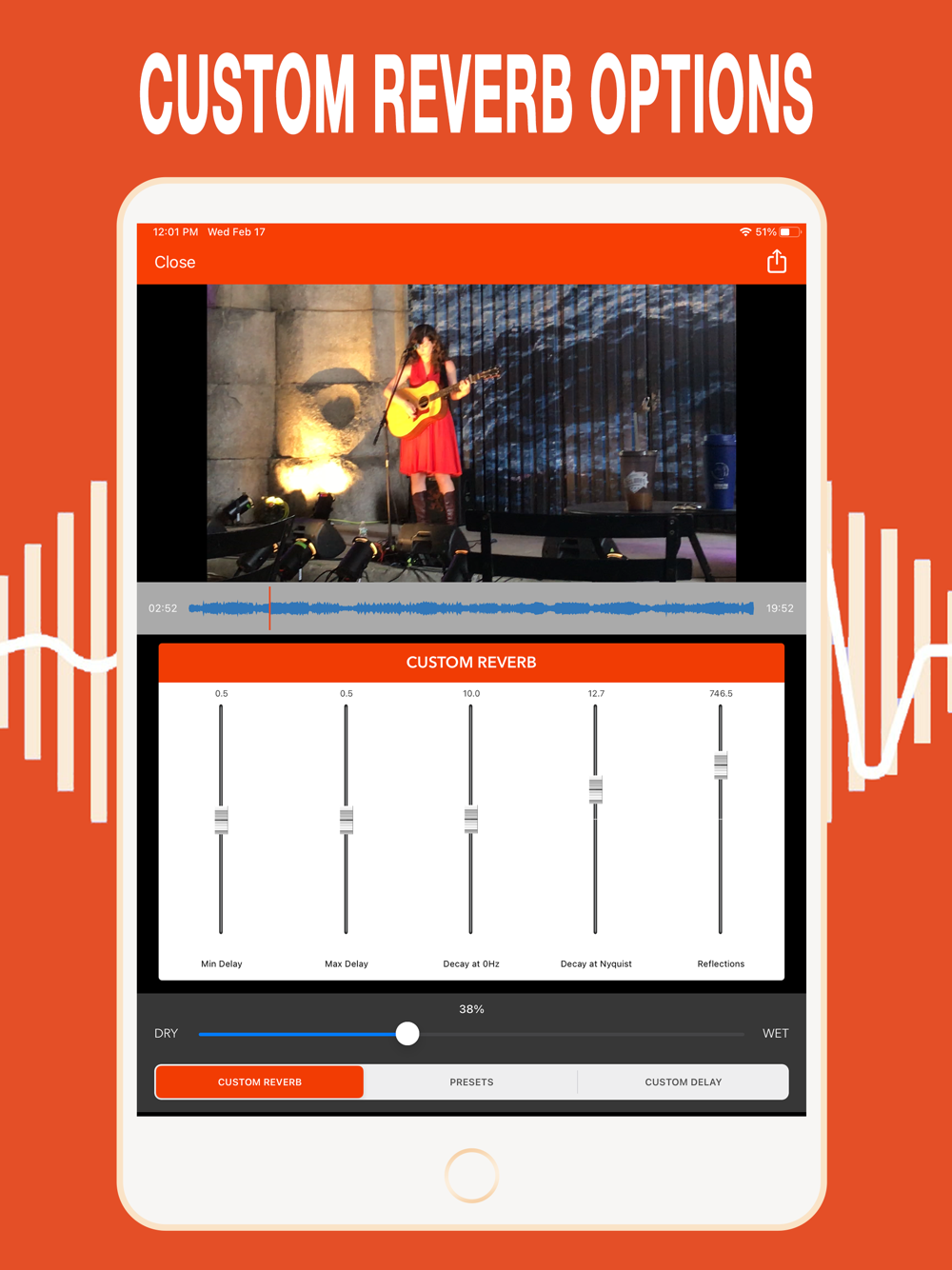 Import a video and choose from a variety of reverb presets. Adjust the Wet/Dry to add a little effect or a lot. You can also create your own Custom Reverb and Custom Delay..