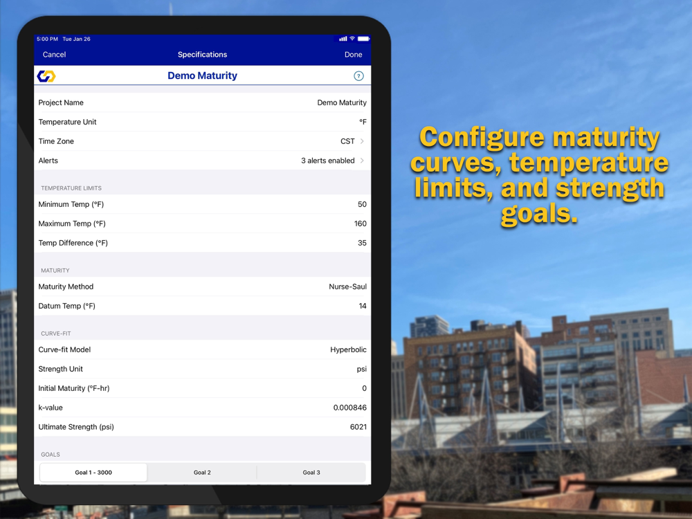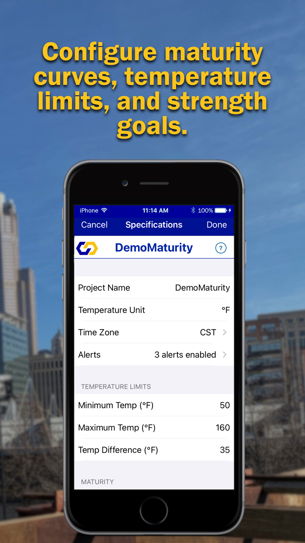 Transmit concrete temperature and maturity data wirelessly. Use COMMAND Center to measure and log concrete temperature history, calculate maturity, and evaluate in-place strength. With COMMAND Center for iOS you can: