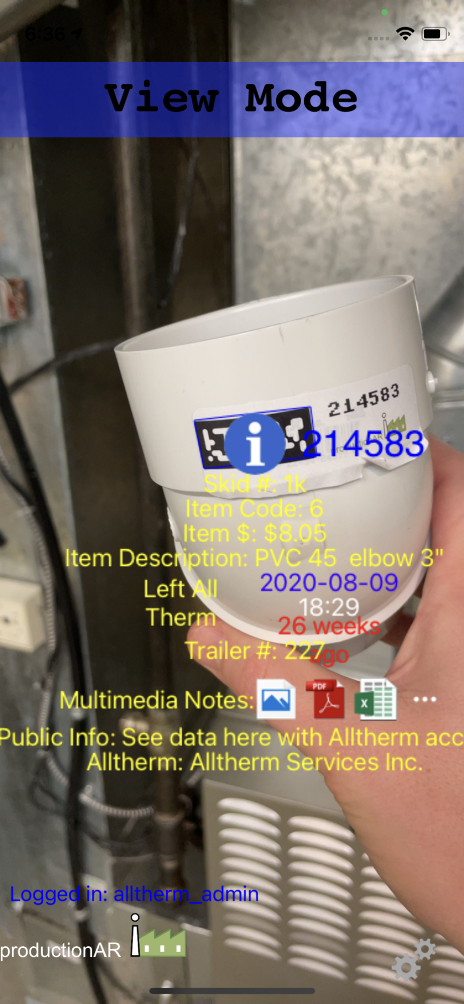 The app has three modes: the default "View Mode" which shows information associated with a visual code, QR-code, or barcode and has the option (if your login has data "Add Permission") to upload multimedia files to the visual code. If you tap the blue 'I' icon hovering over a visual code you can enter "Full Item Mode" where you can see the entire record (or the fields your login allows you to see). In "Scan Mode" you are viewing and possibly changing only one column in the database, for example "Received on Site". If a visual code has not yet received an entry for that column it will appear as a red circle, if it has data already it will be a green checkmark. You can set the "Scan Distance" so that if you get within that distance it will update that field (if empty or with "Re-Scan" enabled). In "New Job Mode" you can aim at a visual code that is not yet in the database and create a new entry.