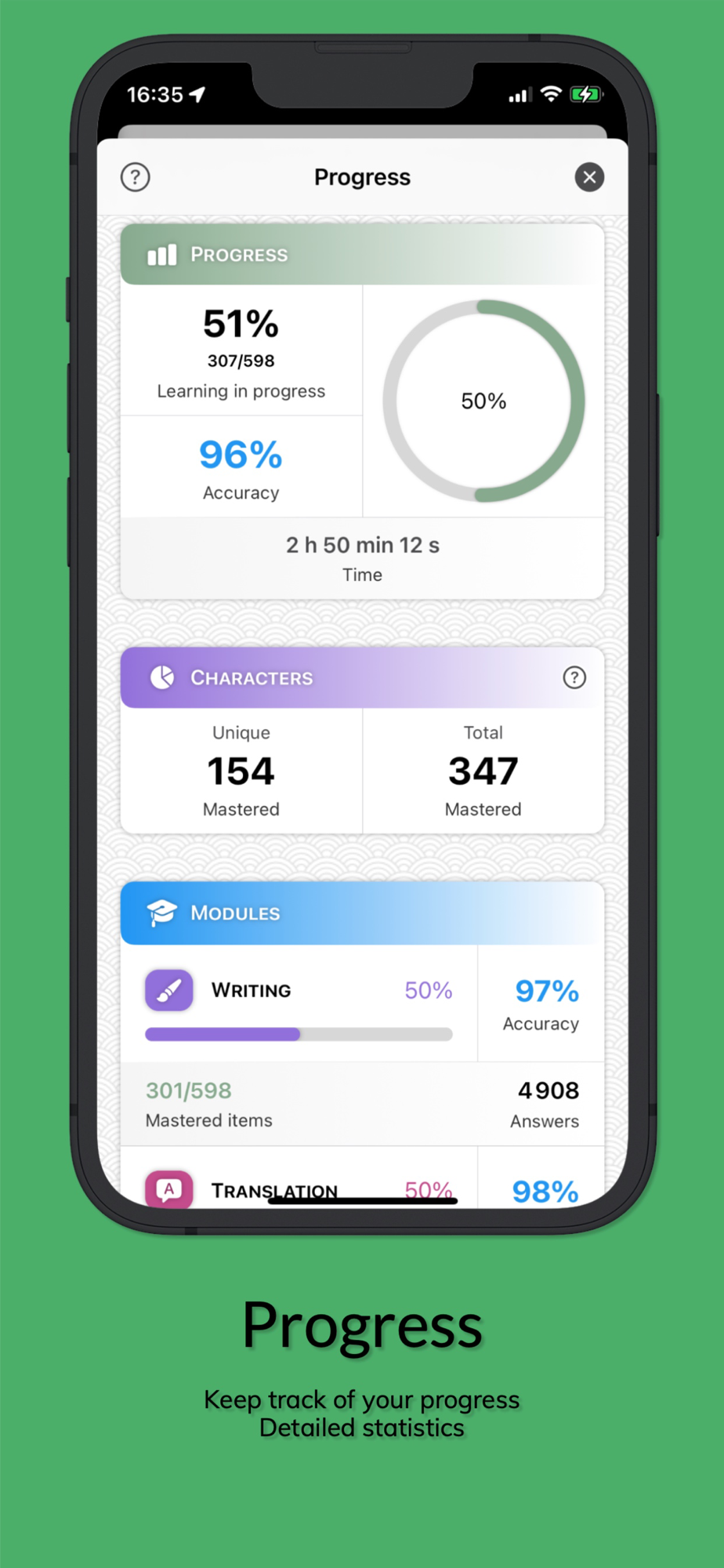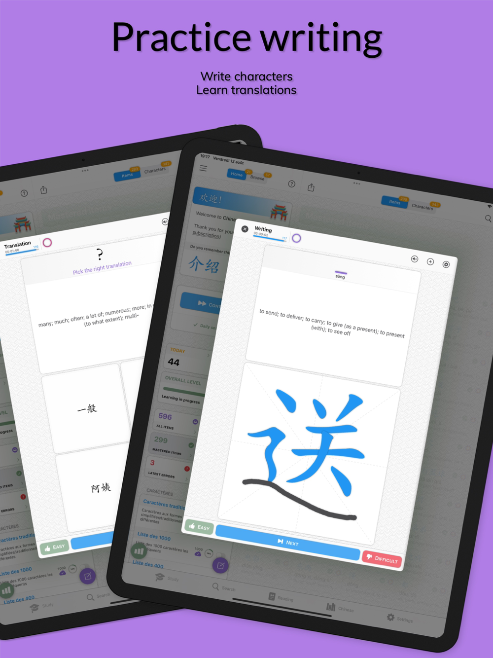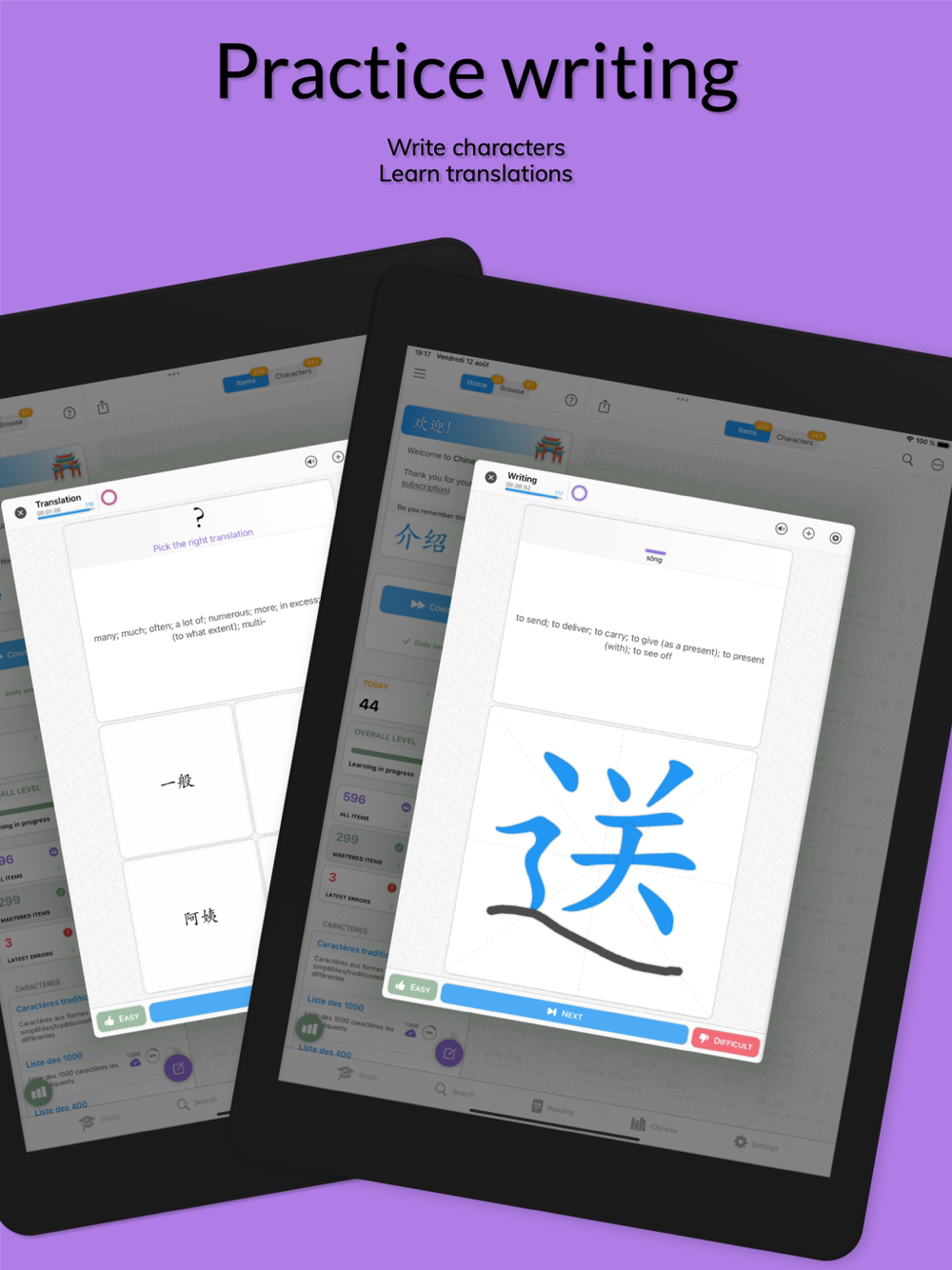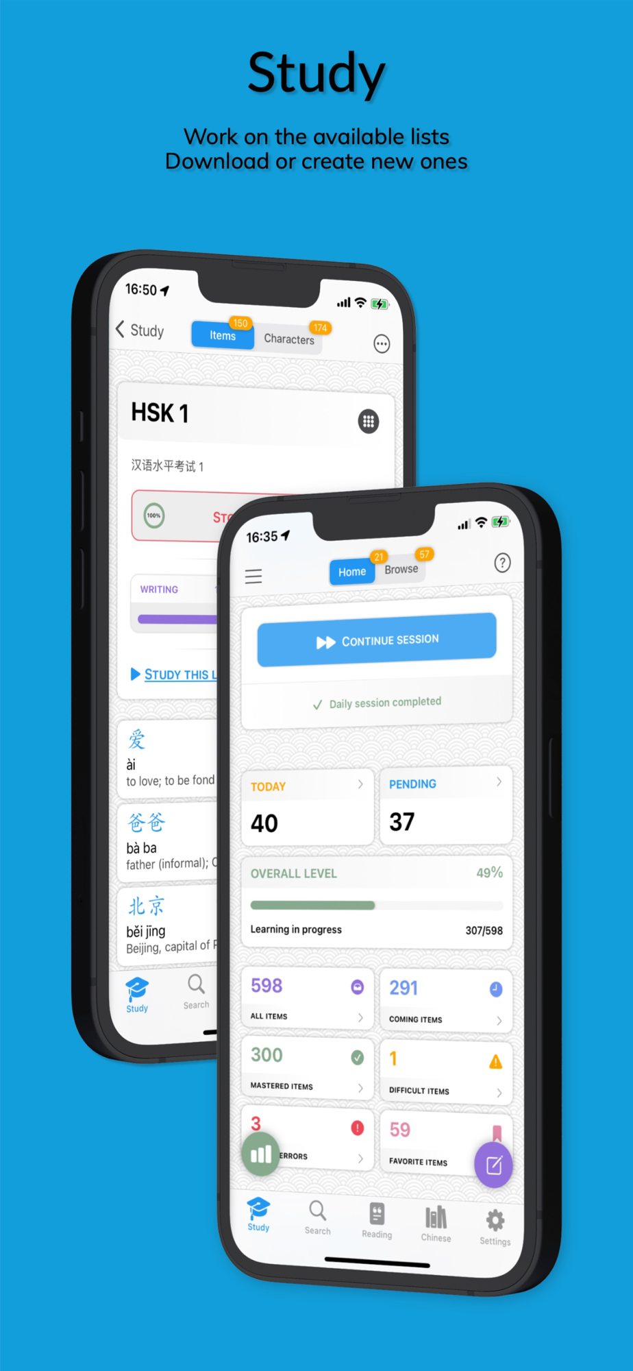 • Study the lists already available or create your own lists of Chinese characters and words. Just enter you words in Chinese and the app will translate them. You can even download commonly used Chinese textbooks words lists.