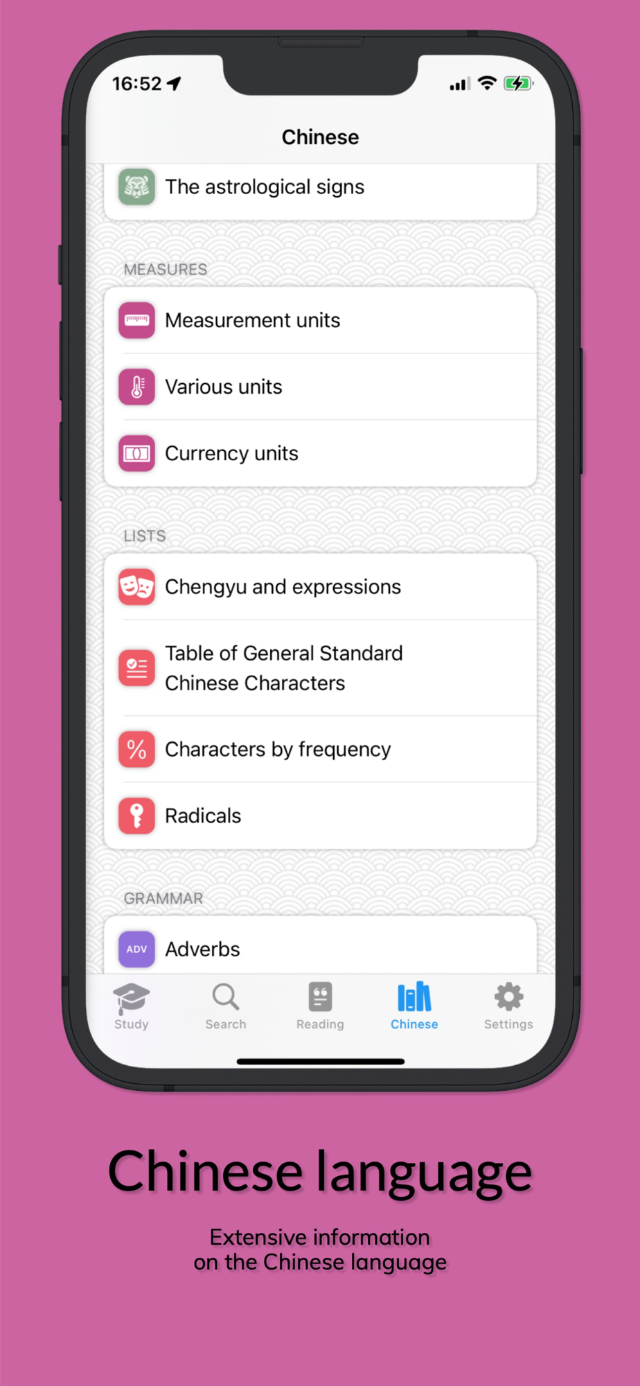 • Read Chinese texts and documents easily in the reading section.