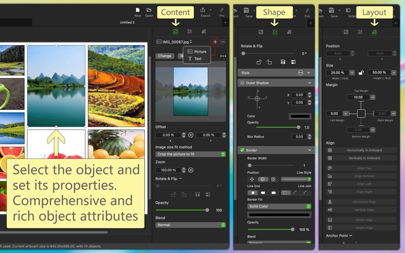(3) You can add various drawing objects such as pictures, text, and shapes. You can set various attributes such as the content, style, shape, and layout of the drawing object.