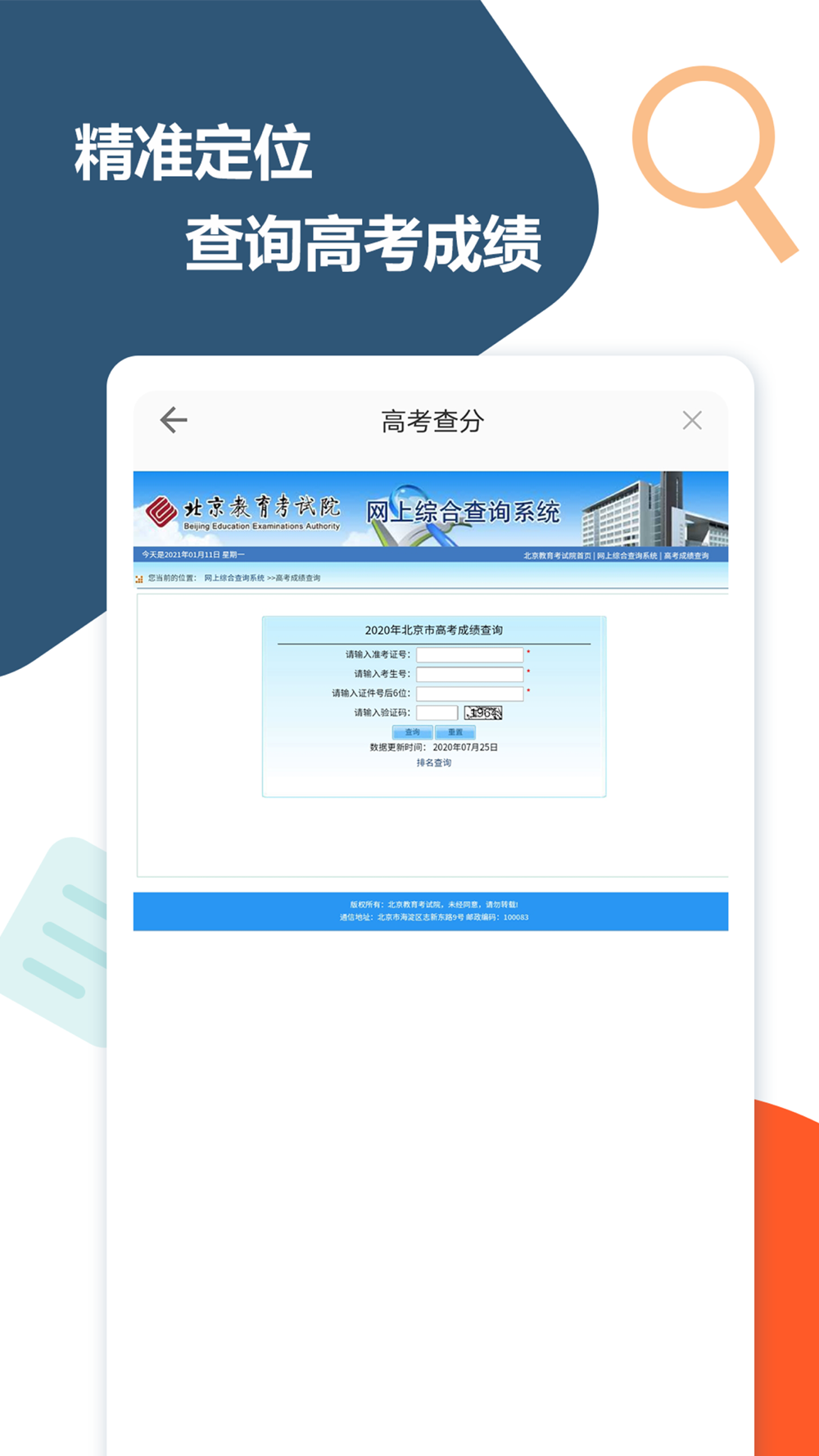 一款实时在线查询高考分数的APP,查询考试分数选择地区,输入考试时间,输入准考证好和考生号,即可实时查看自己的考试成绩,排名位次。