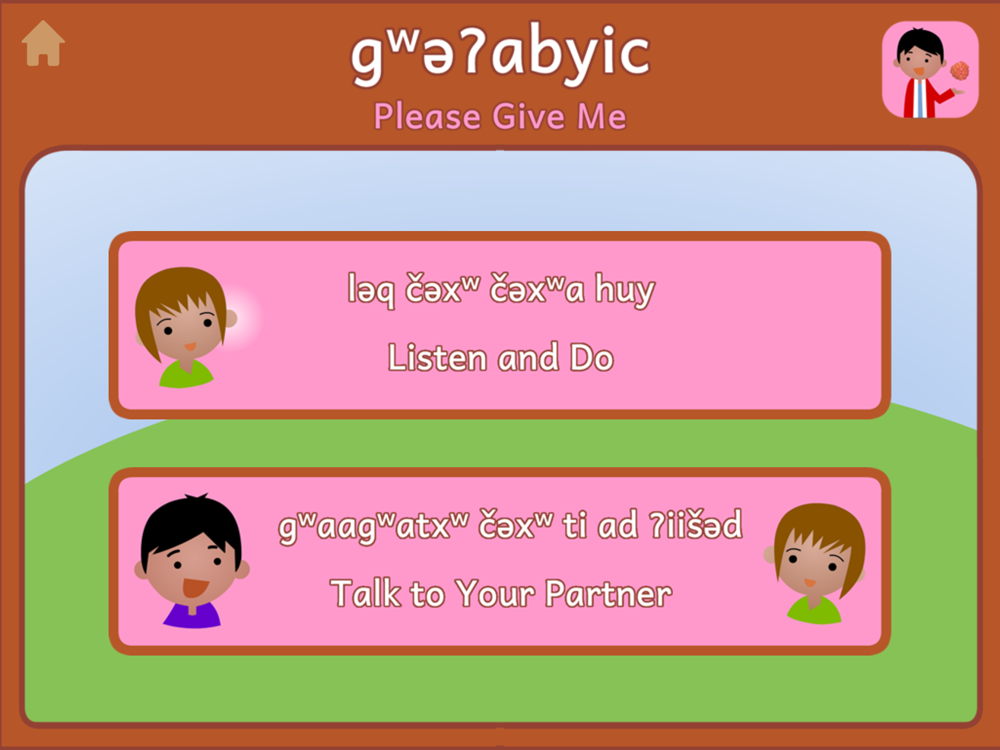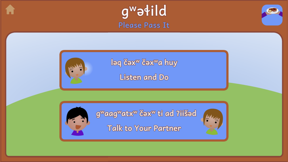 Set this app on your table, and you and your family can practice the language of our elders as you share a meal together. Learn and practice how to say "Please give me..." and "Please pass the __ to __."