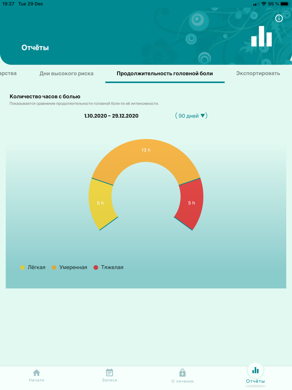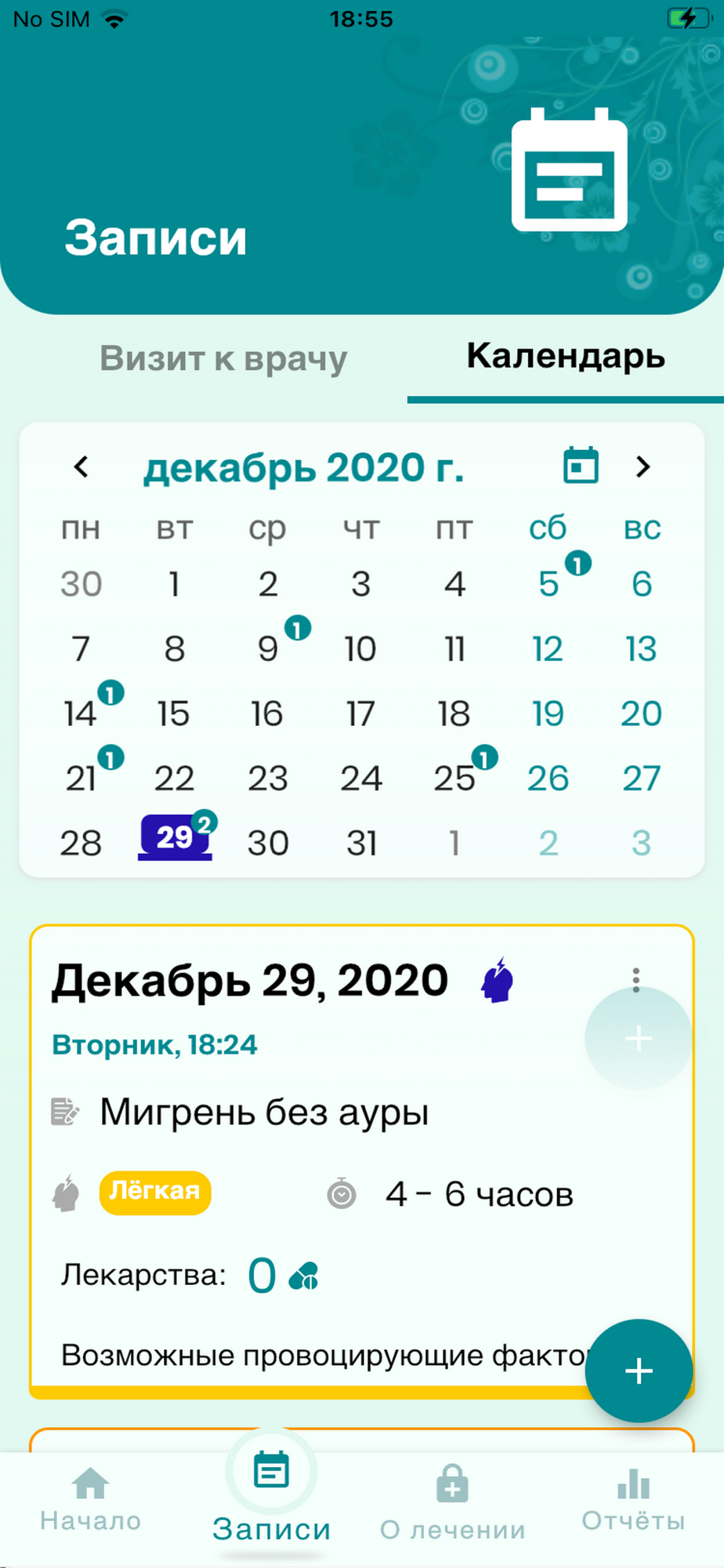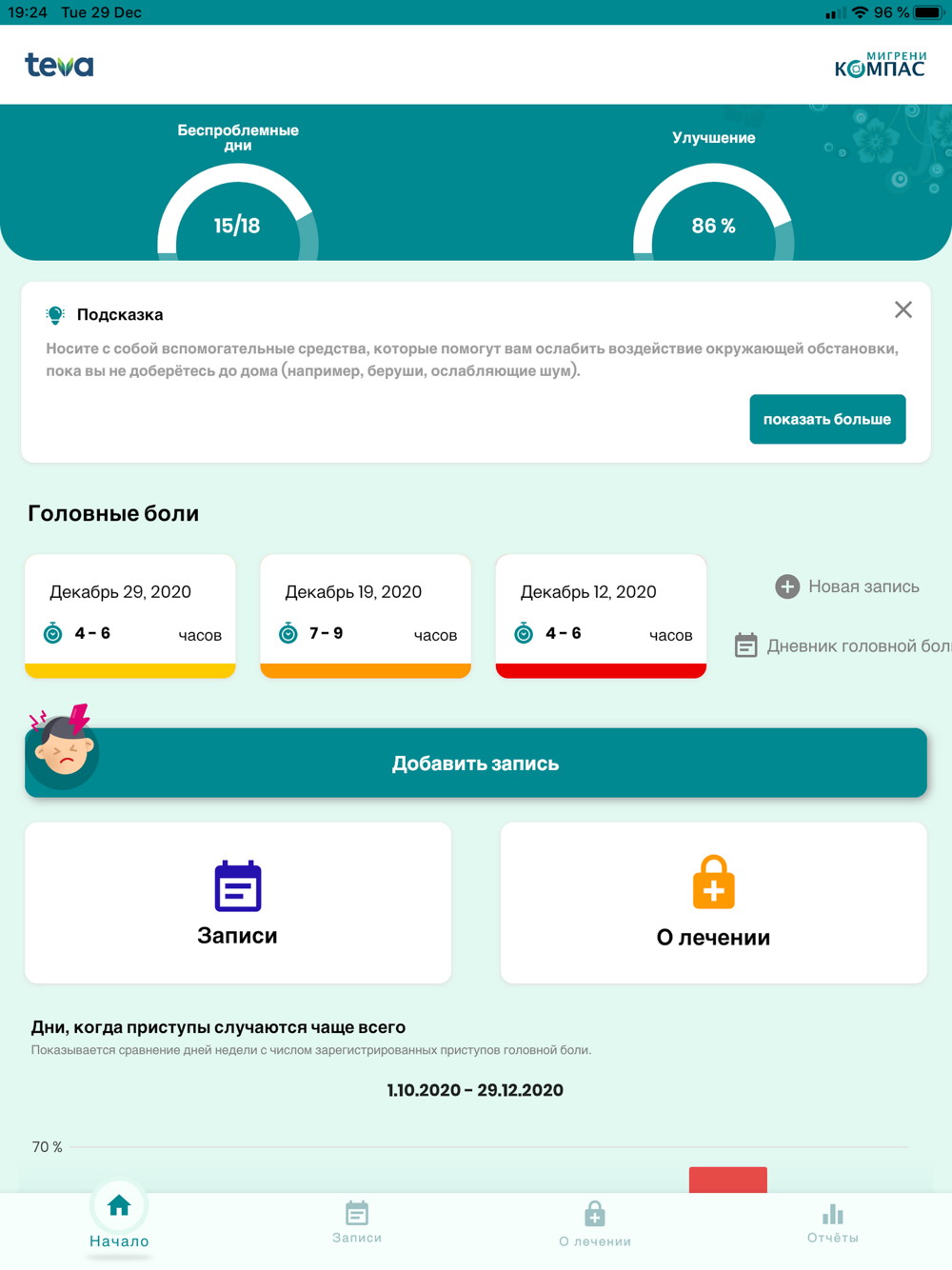Очень полезный дневник позволяет регистрировать приступы и провоцирующие факторы, а также другие события (например, визиты к врачу). Другое преимущество — возможность отслеживать изменения в реальном времени, анализировать возможные провоцирующие факторы, приём лекарств и дни с высоким риском.