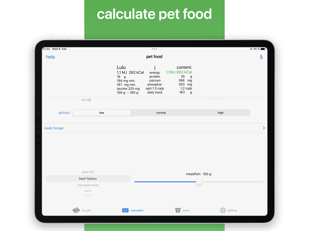 Your dog or cat needs different nutrients and minarals depending on their age and weight. The app pet food fresh helps You choosing age and weight, to compile individual the best balanced nutrition. Pet food fresh accompanies You through the entire life of your pet, from puppies to any age, when your pet needs completely different food.