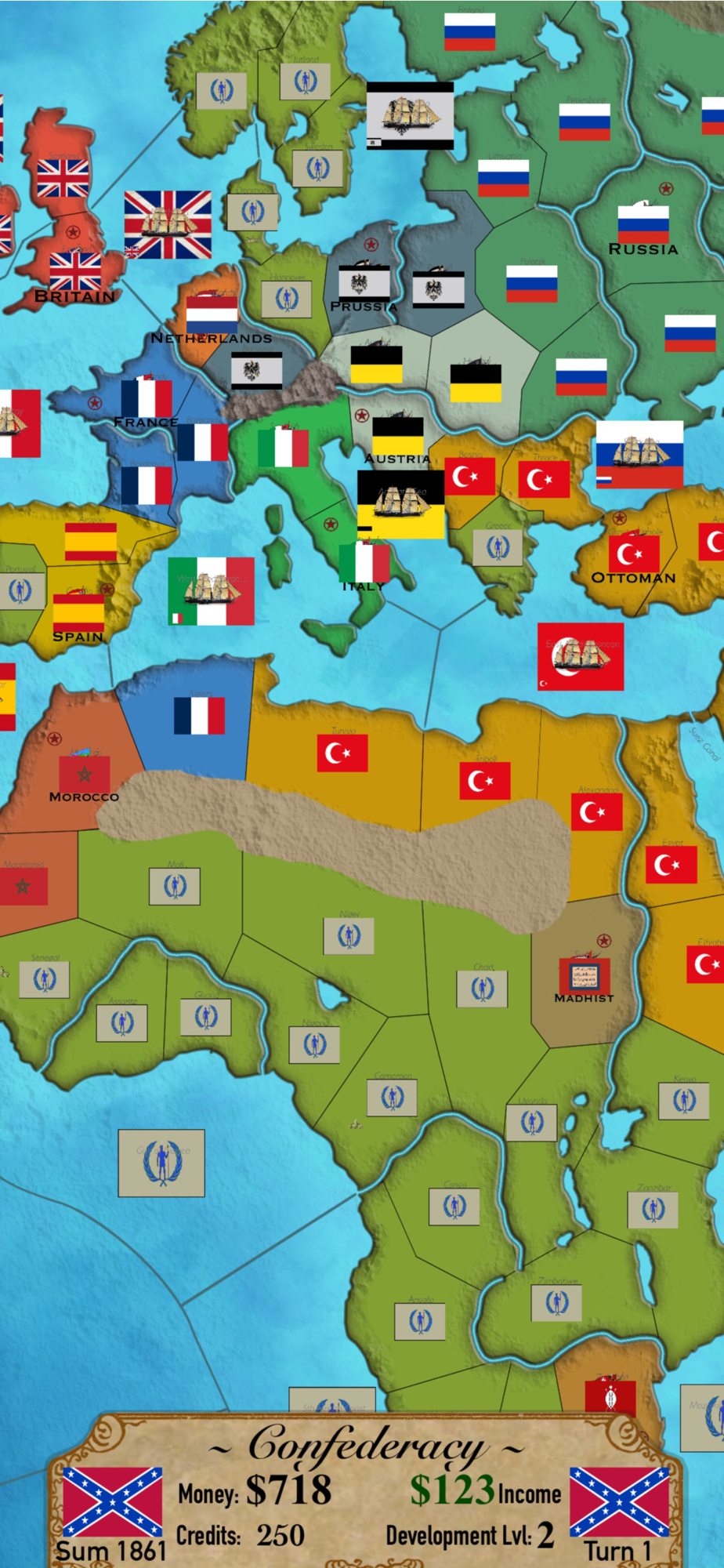 Colonies at War is a game set in the 19th century during the rush by colonial powers to colonize the known world. It's a game of building armies and crushing enemies. Pick one of the 28 nations available, look for the best lands nearby, then send in your armies to conquer them. Make allies of your friends, and war on your enemies. Build your navies to control the seas and become the greatest nation in history.