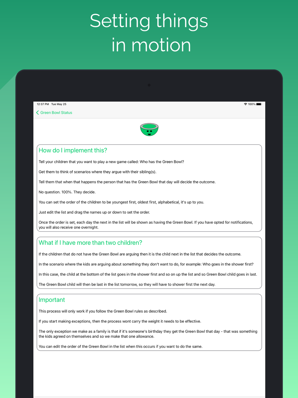 Whoever has the Green Bowl will decide who sits in the front seat, who has the shower first, who chooses what to watch on TV, the list goes on.