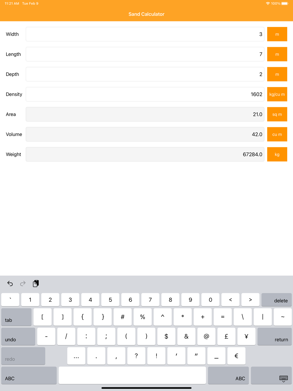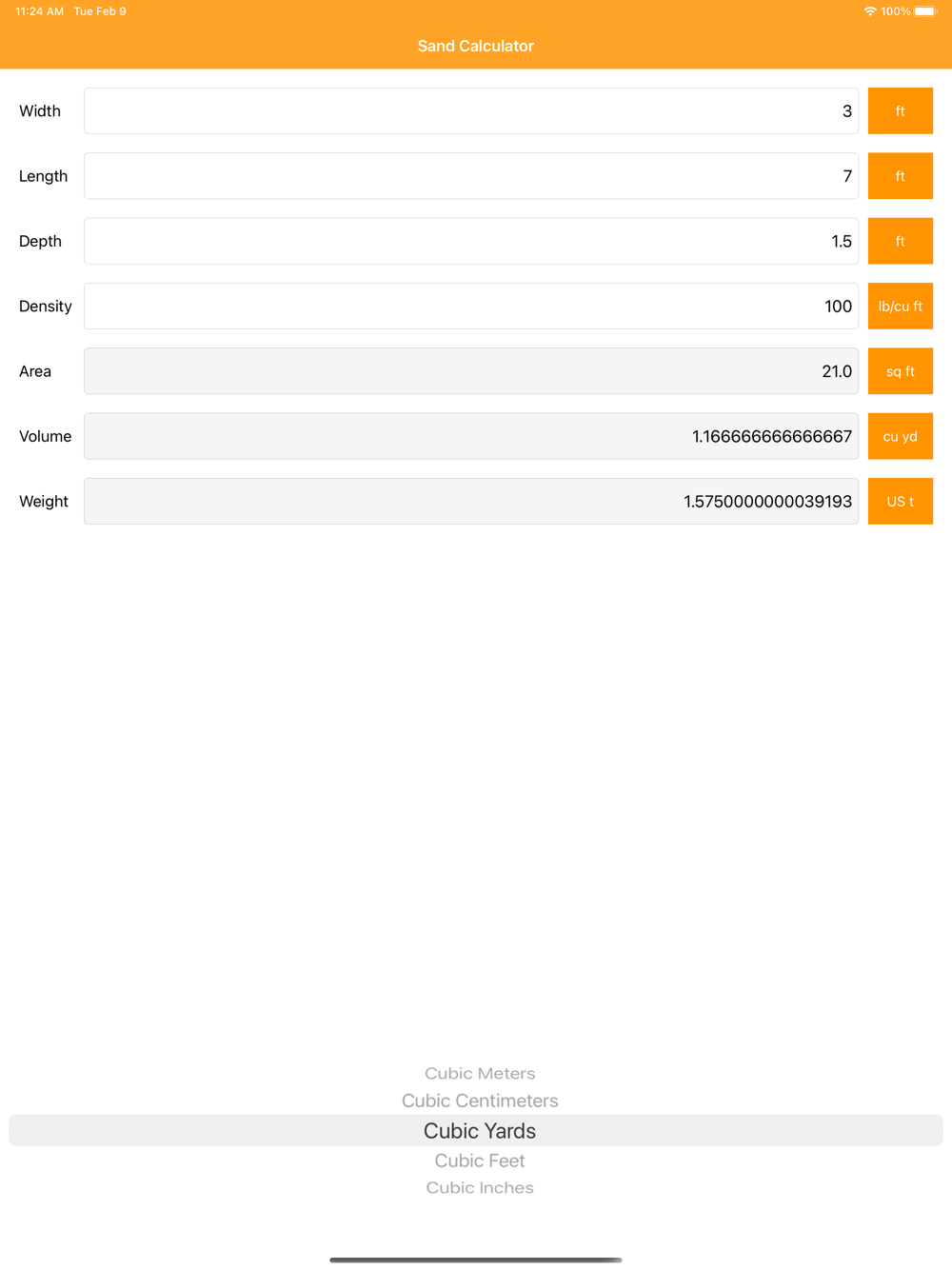 Sand Calculator is the fastest real-time calculator a sand that quickly convert between the imperial and the metric system’s units for Width, Length, Depth, Density, Area, Volume and Weight in real time and without any hassle.