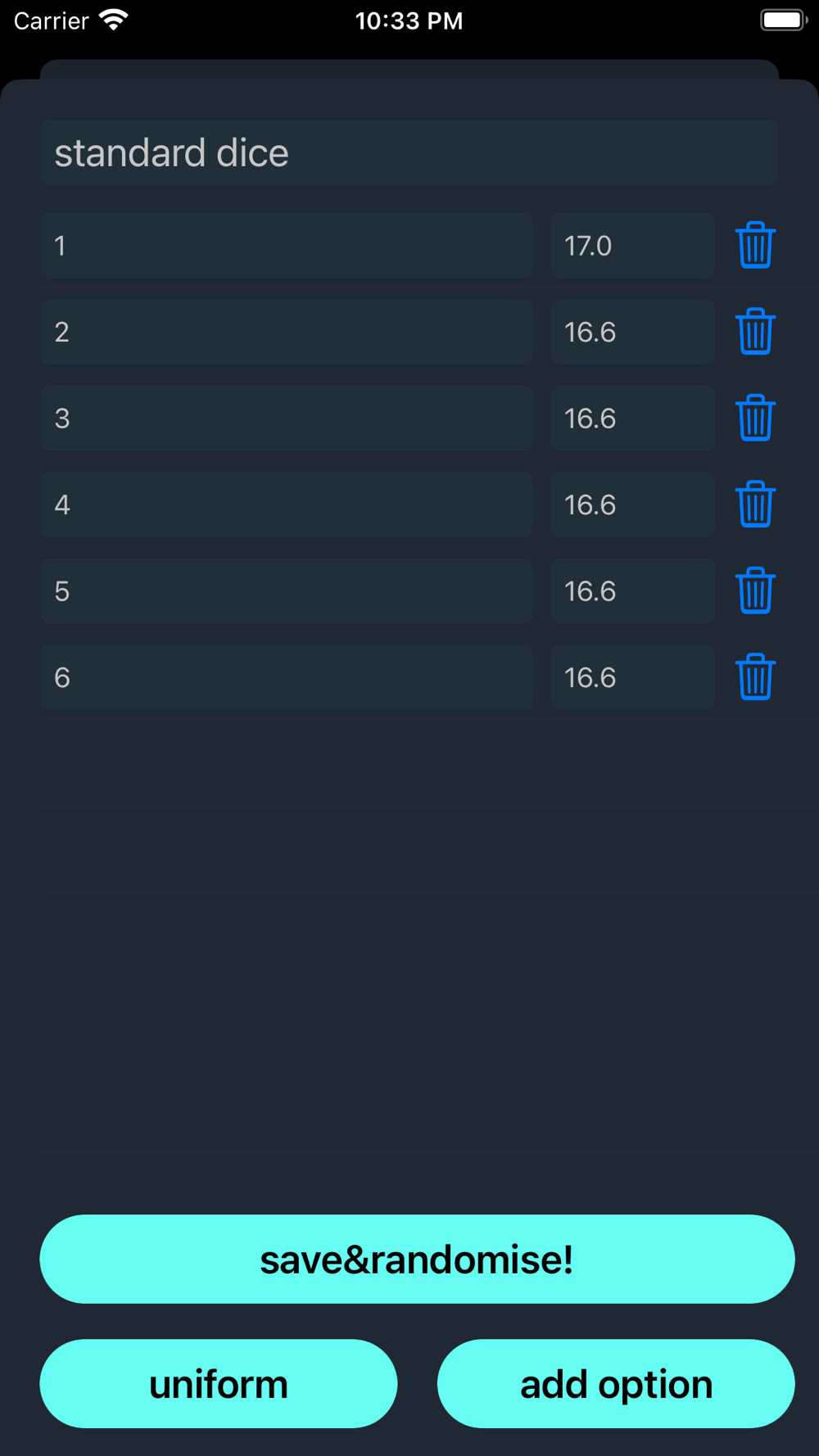 Playing a board game with your friends and the dice got lost? Now you can simulate it on your phone! Need to determine who does the dishes? You can do it too! All of your "random" needs are covered with this app. Build complex multi-option biased randomiser schemes or simply pick bias and make a "face flip".