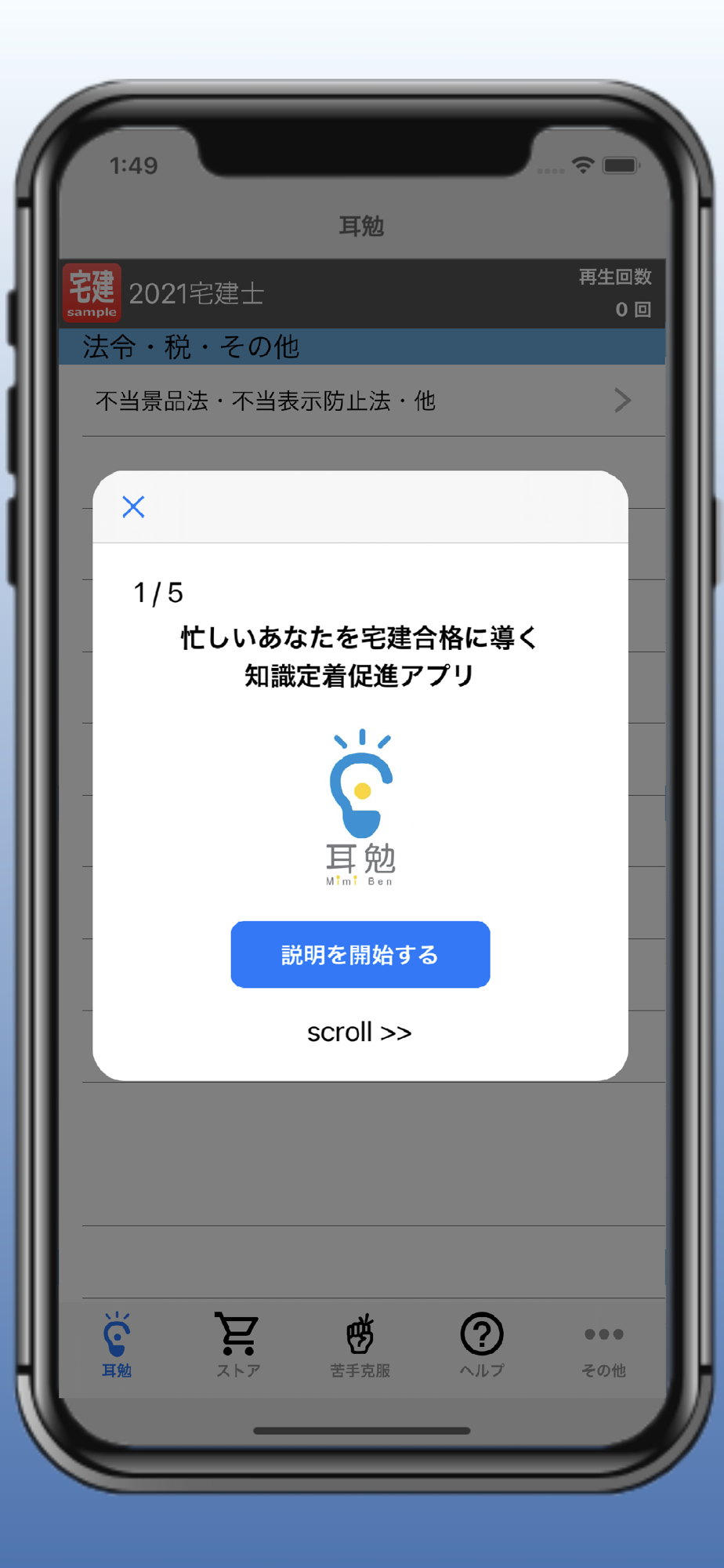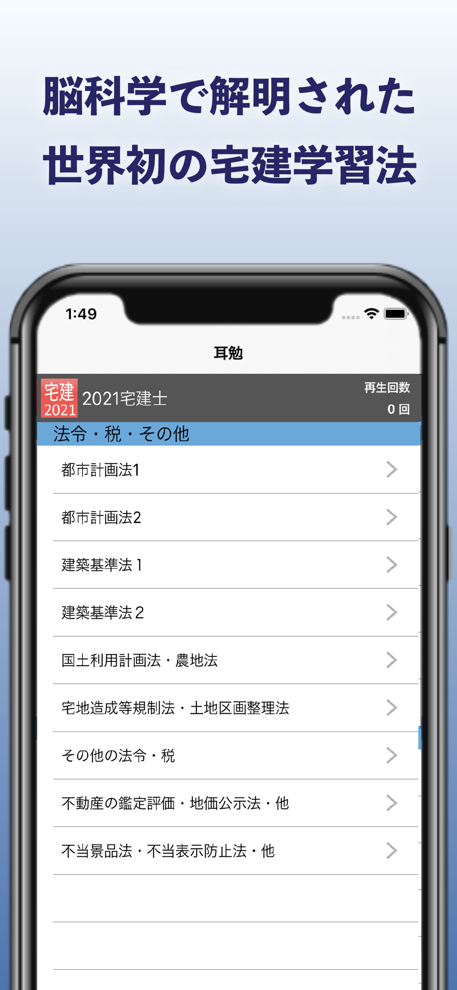 宅建合格に重要で必要な「法令上の制限・その他」が収録されています。社会人の方にとってこの暗記は時間のない中でやらなくてはなりません。たいがいの人がテキストを理解するのが精一杯で、覚え込むまでには時間が足りないのが現状です。そこで、三重音声を聴くだけで、集中力を拡張させ、短い期間に暗記ができるように『耳勉』を開発しました。特に再受験の方には強い味方となります。また初受験の方には、学習をサポートする頼もしいツールとなります。