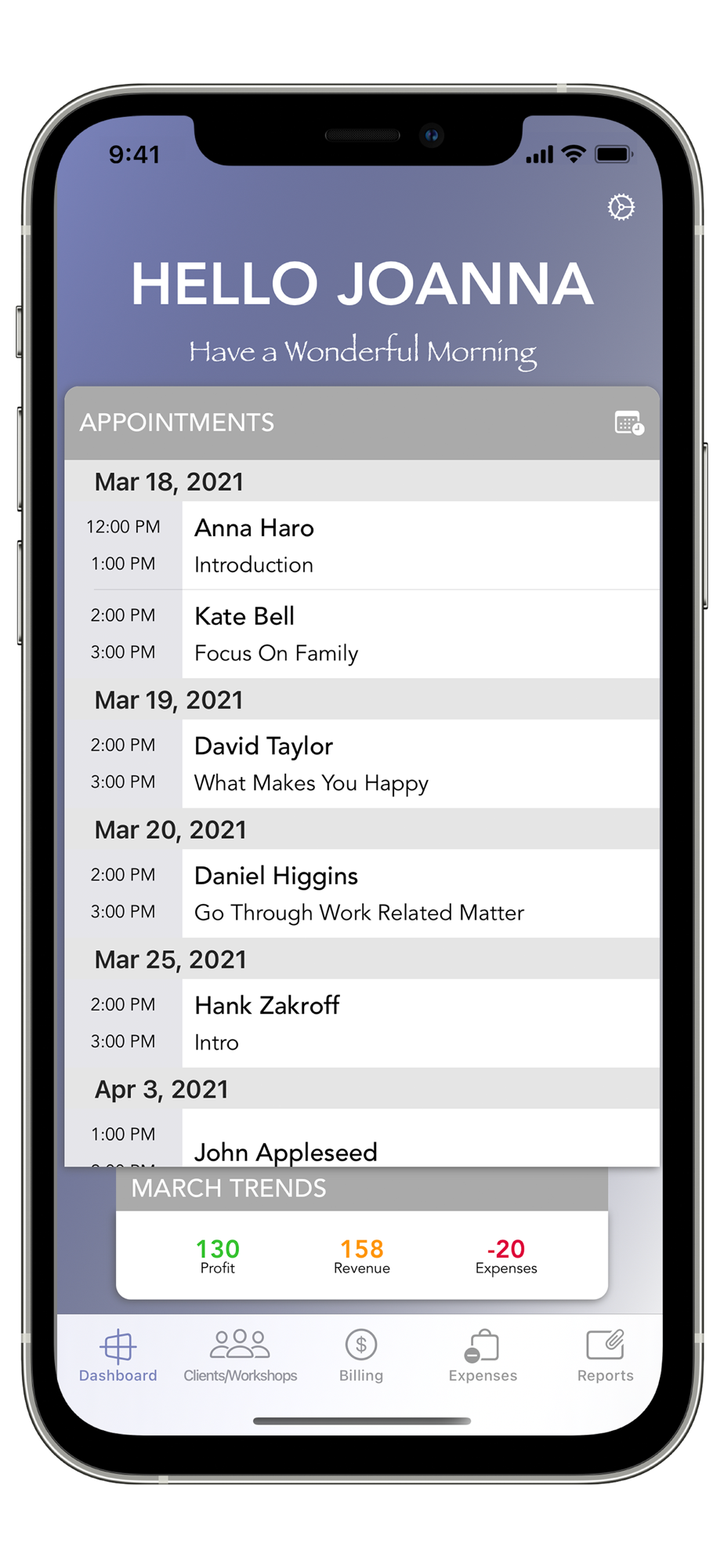 The Smart Coach is a complete, modern solution for your Practice, designed for your every day use with speed and security in mind. Keep track of your clients and their sessions, schedule appointments, generate bills and invoices and view beautifully curated reports with a tap of your finger.