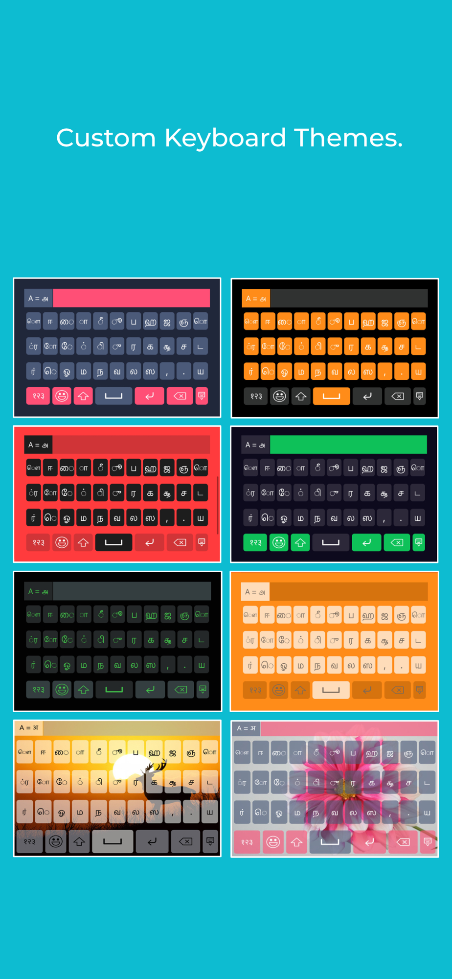 • Change colors for the Background colour, Key background colour, Keyboard text colour, Suggestion box colour etc, so that typing does not seem boring and monotonous with this Tamil keyboard for iOS.