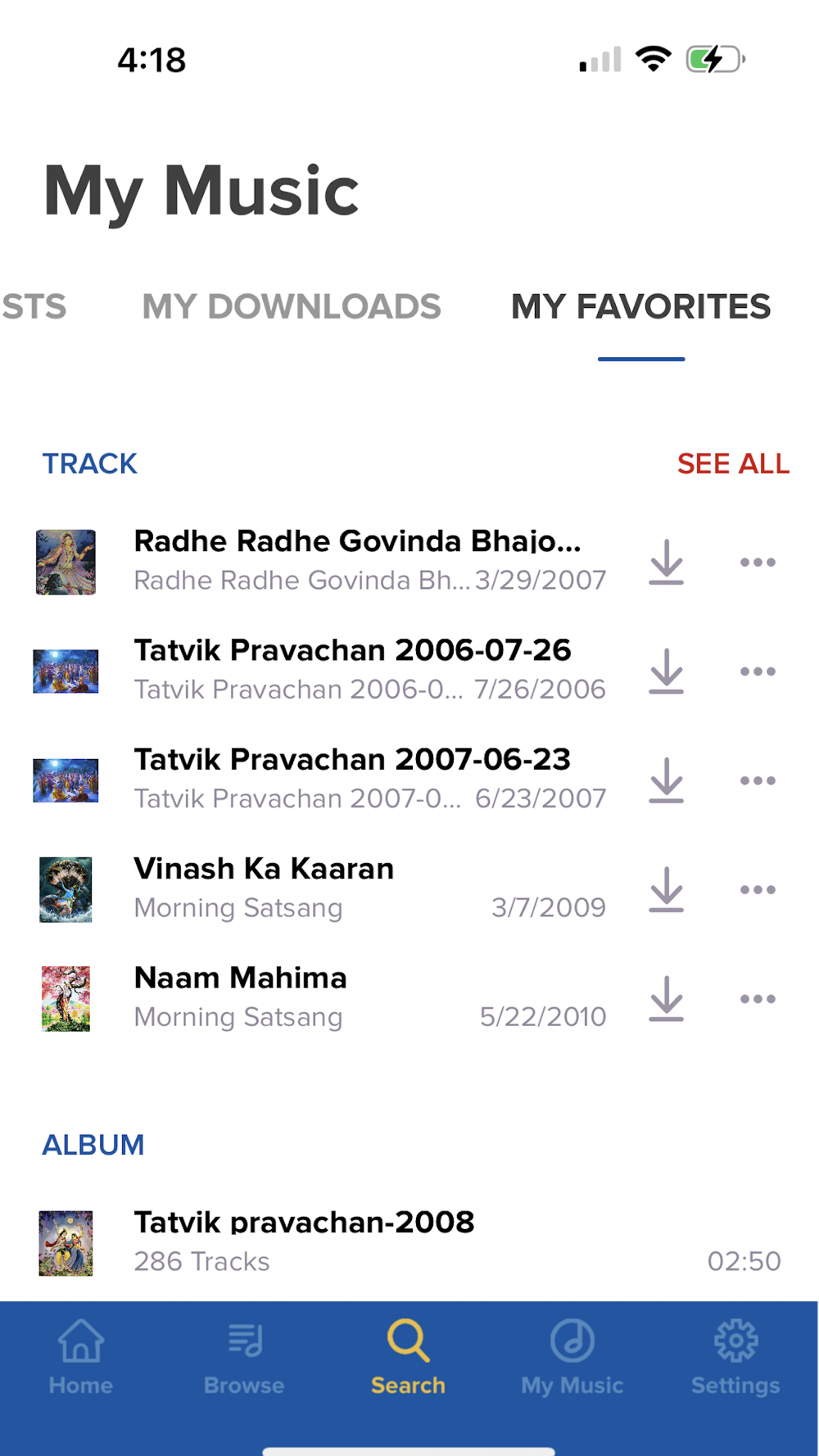 • Search - Now it is very easy to search Satsang tracks and albums. You can search a track from the search section, where result will include tracks as well as albums. Each section has its own search feature at the top, which allows you to search for a track within that section, for example, you can search a track from within an album. You can also filter the search result based on recorded dates.