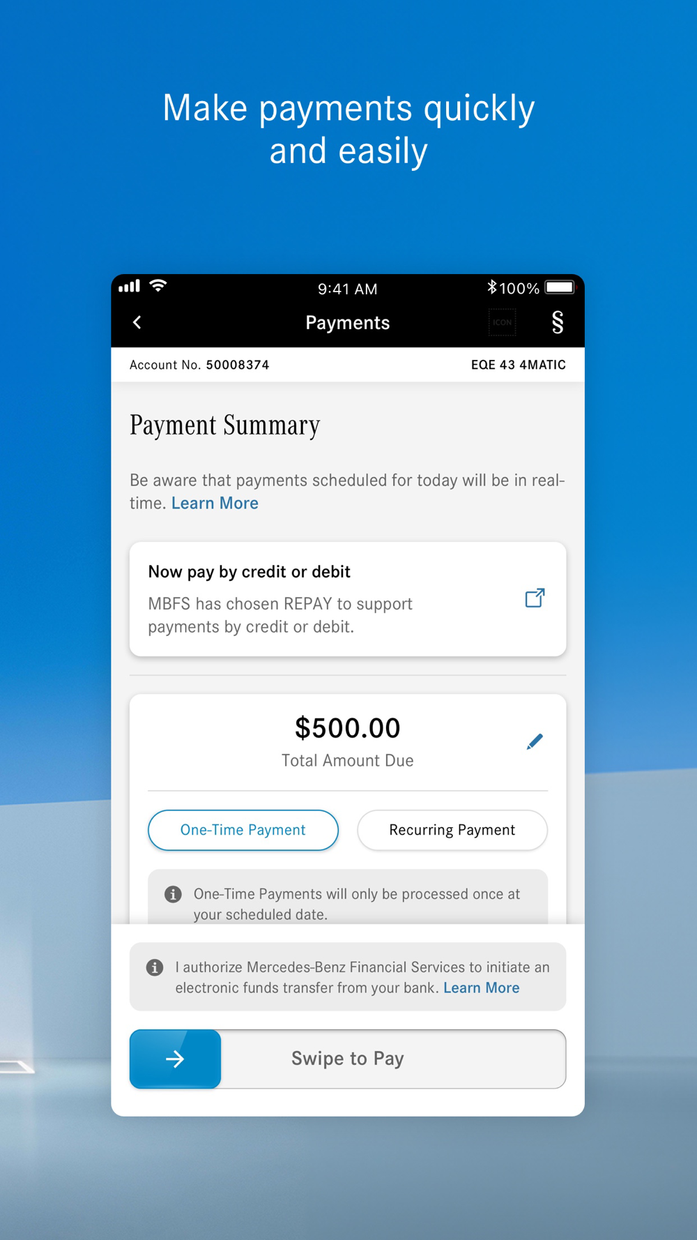 Mercedes me Finance app serves as a perfect complement to the Mercedes me app. It allows you to manage your Mercedes-Benz Financial Services account on the go and comes loaded with features designed for speed and simplicity — so you can spend your time doing the things you really enjoy, like driving your Mercedes-Benz. Get ready, set, and tap to download our convenient app today. Just a few of the many app features: