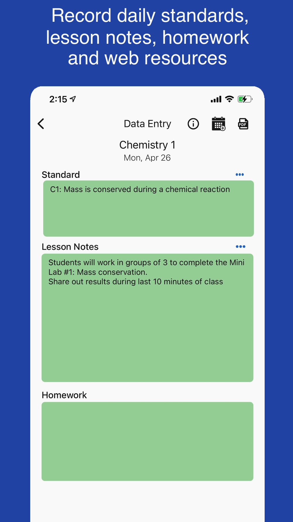 Class Planner allows teachers to easily keep a record of their lesson plans which include the standards, lesson notes, homework and an online web resources.