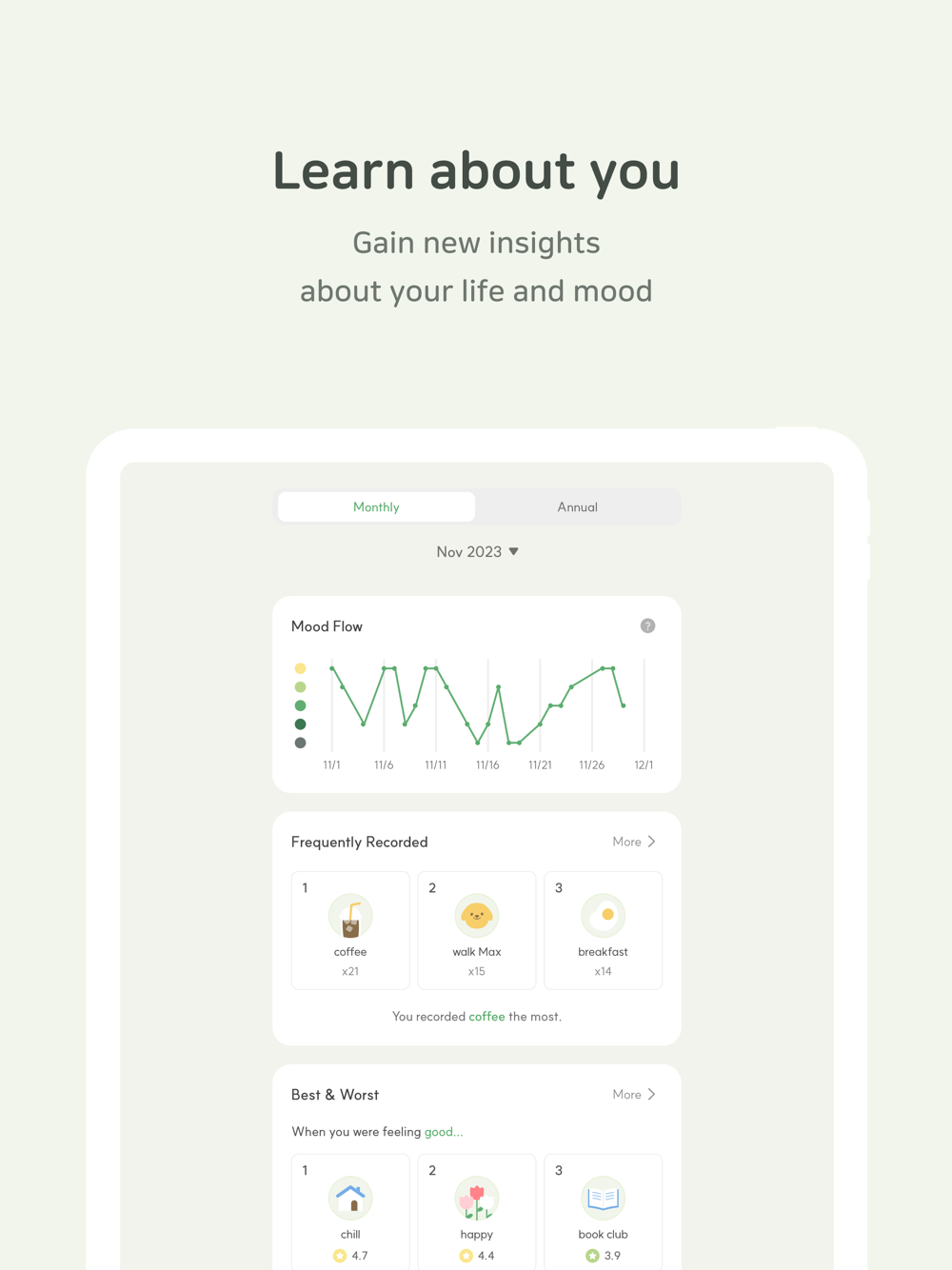 Look at your mood flow through statistics and see what activities affect your mood. You can also check the number of icon records on a weekly and monthly basis.