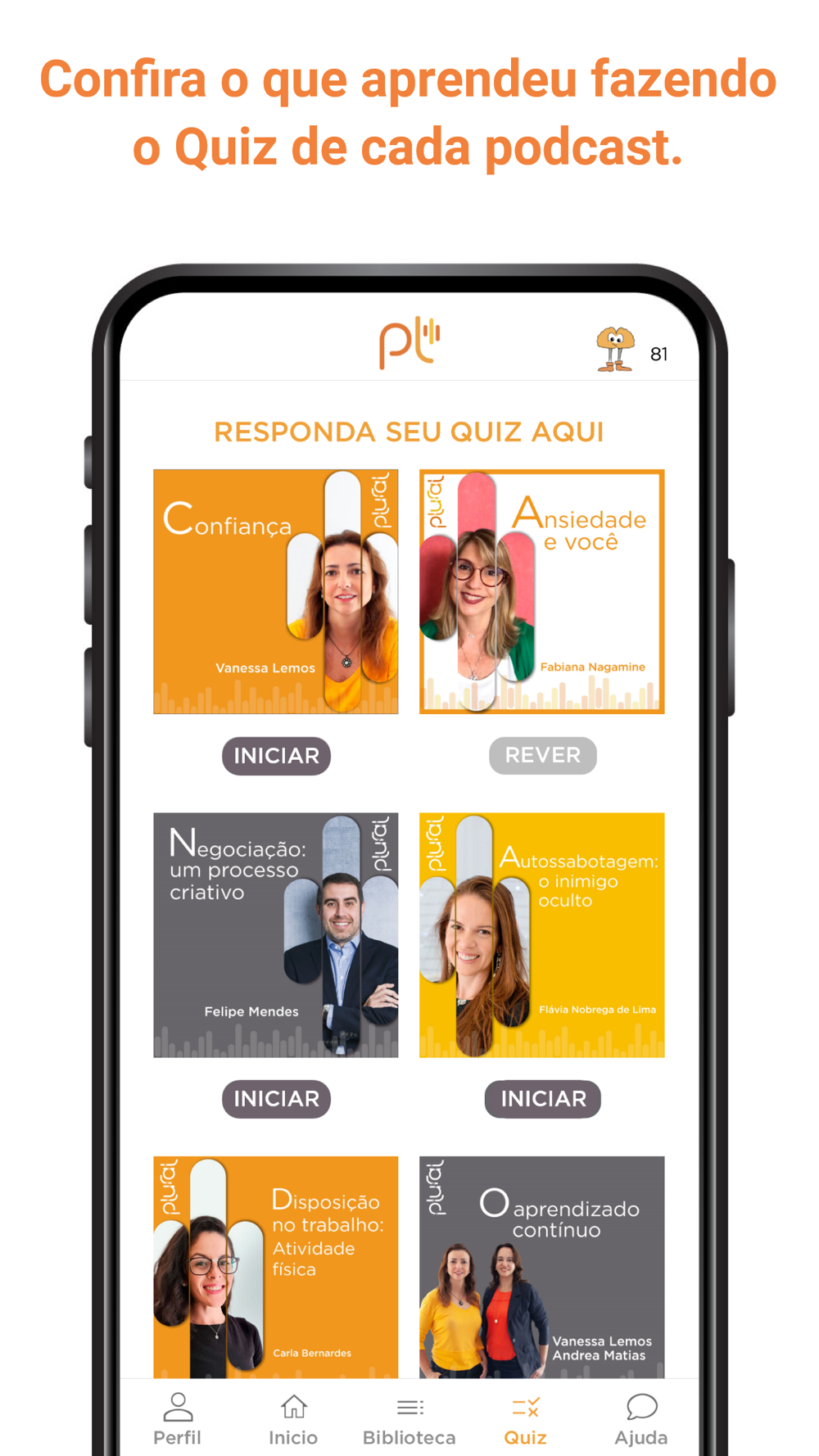 Baixe agora mesmo o aplicativo da Plural e ouça podcasts que englobam o cuidado e o desenvolvimento completo do ser humano, com metodologia baseada na Neurociência do Aprendizado. Divirta-se acumulando Plurais e receba certificados que atestam o seu aprendizado, além de testar o seu aprendizado respondendo quiz.
