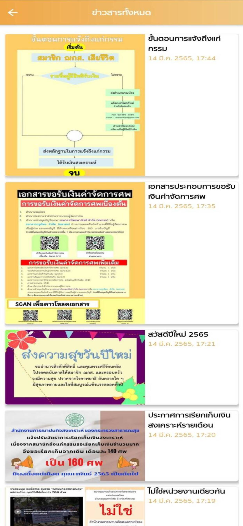 แอปพลิเคชั่นนี้เป็นแอปพลิเคชั่นของสำนักงานการฌาปนกิจสงเคราะห์ของกระทรวงสารธารณสุข โดยตัวแอปพลิเคชั่นนี้จัดทำมาเพื่อให้สมาชิกสามารถรับข่าวสาร ประกาศและเช็คยอดเรียกเก็บและยอดคงค้างในการเรียกเก็บเงินสงเคราะห์ของสมาชิกในแต่ละเดือน