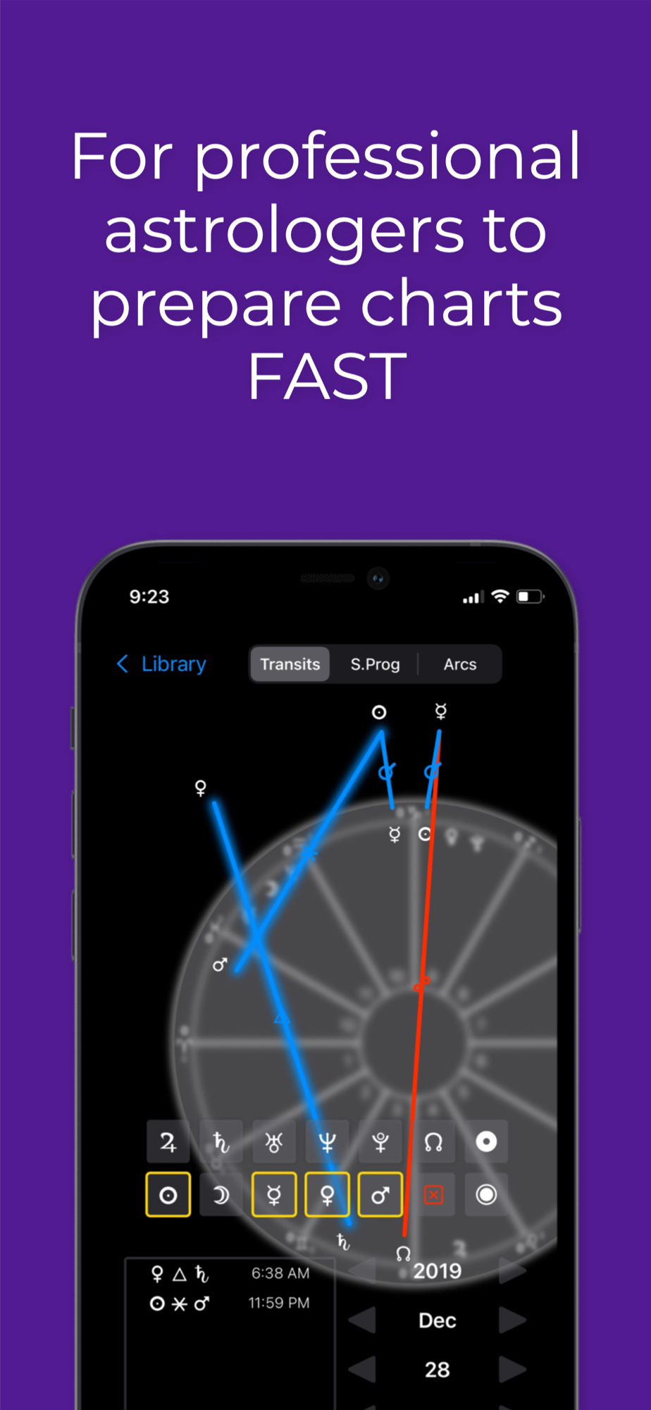 No more printing out pages and pages of lists, bi-wheels, and tri-wheels. Dial up a date, step it forwards and backwards and watch as your selected planets come into orb, become exact, and move out of orb - for all transits, secondary progressions, and solar arcs - allowing you to build an intuition of recent past and near future influences on your client without unnecessary clutter and distraction.