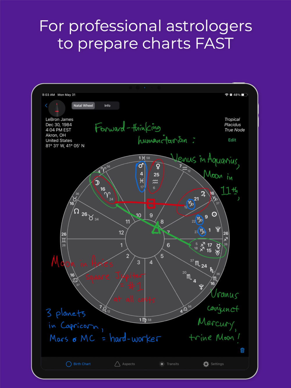 More than any other astrological measurement app, Stellar Analyst is designed to avoid unnecessary information so that your eyes and brain can quickly and easily integrate the left-brain measurements you need in order to let your right brain drive the bus during client consultations.