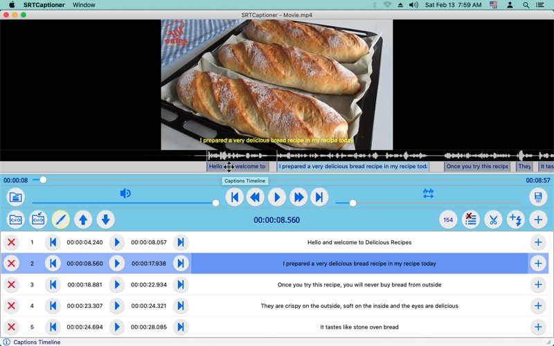 - Set-Start, Set-End, Play, Insert Next, and Delete Buttons Dedicated for Every Caption Entry for fast realtime Positioning.