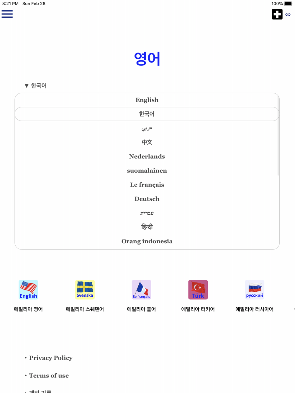You can choose interface language and voice. Vocabularies will be updated periodically.