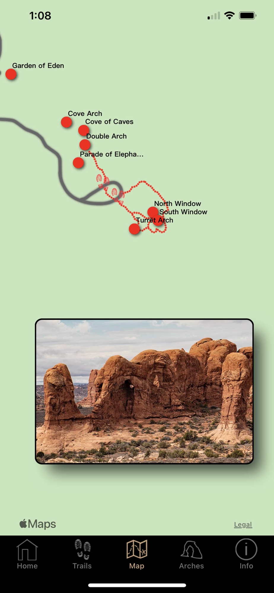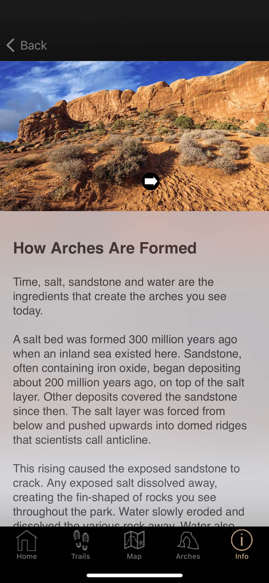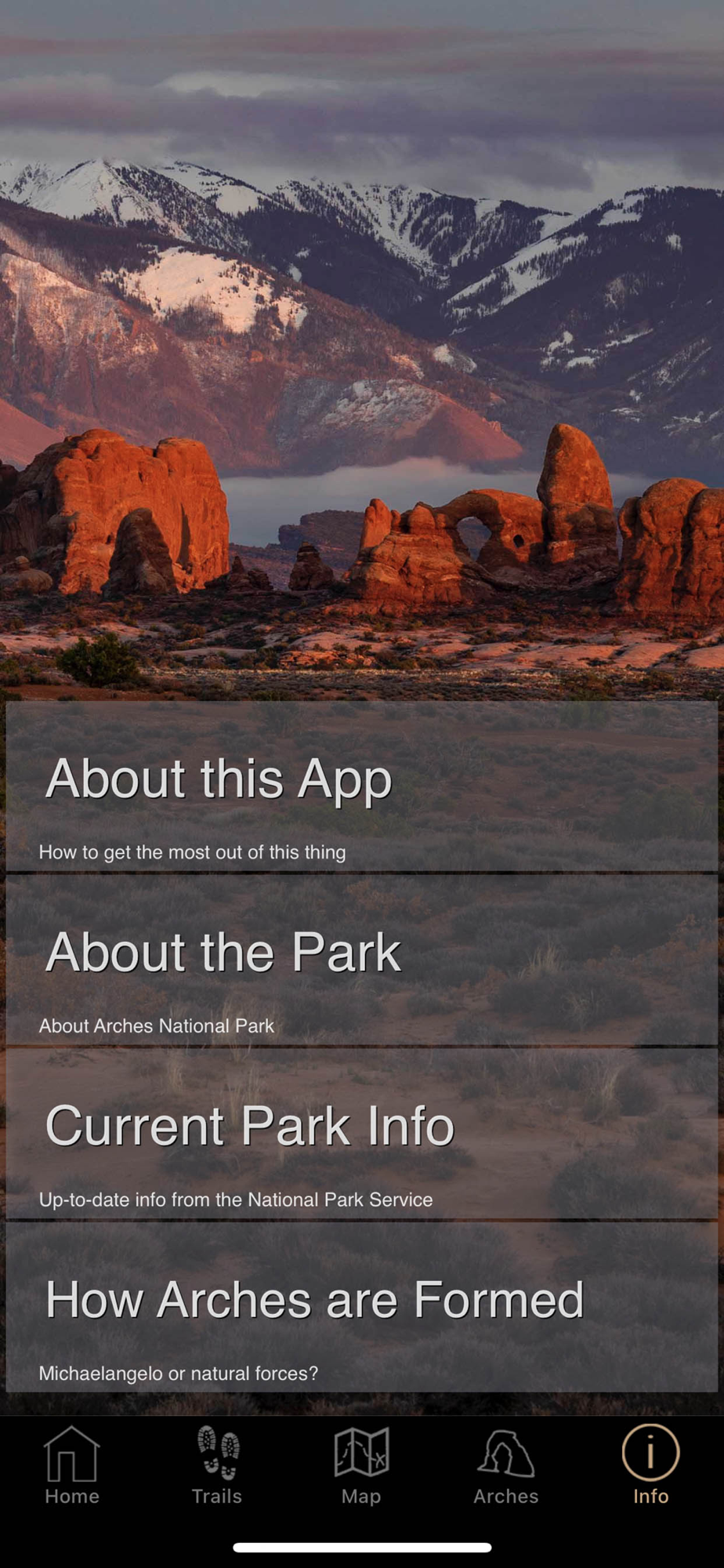 Arches National Park is a natural wonder like no other. Here you will find the highest concentration of arches and other unique rock structures in the world. This app is your guide to this extraordinary park. Use the map to navigate the roads and find the park's arches. Use the trail guides to explore by hiking. We hope you enjoy your visit to this very special place!