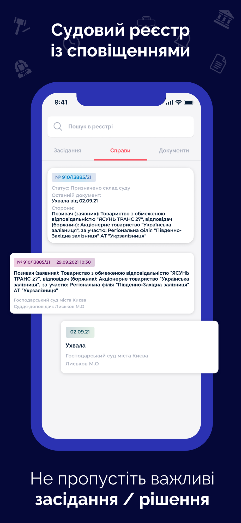 Додавайте справу для відслідковування та отримуйте сповіщення про призначення нових засідань та нові рішення по справі.