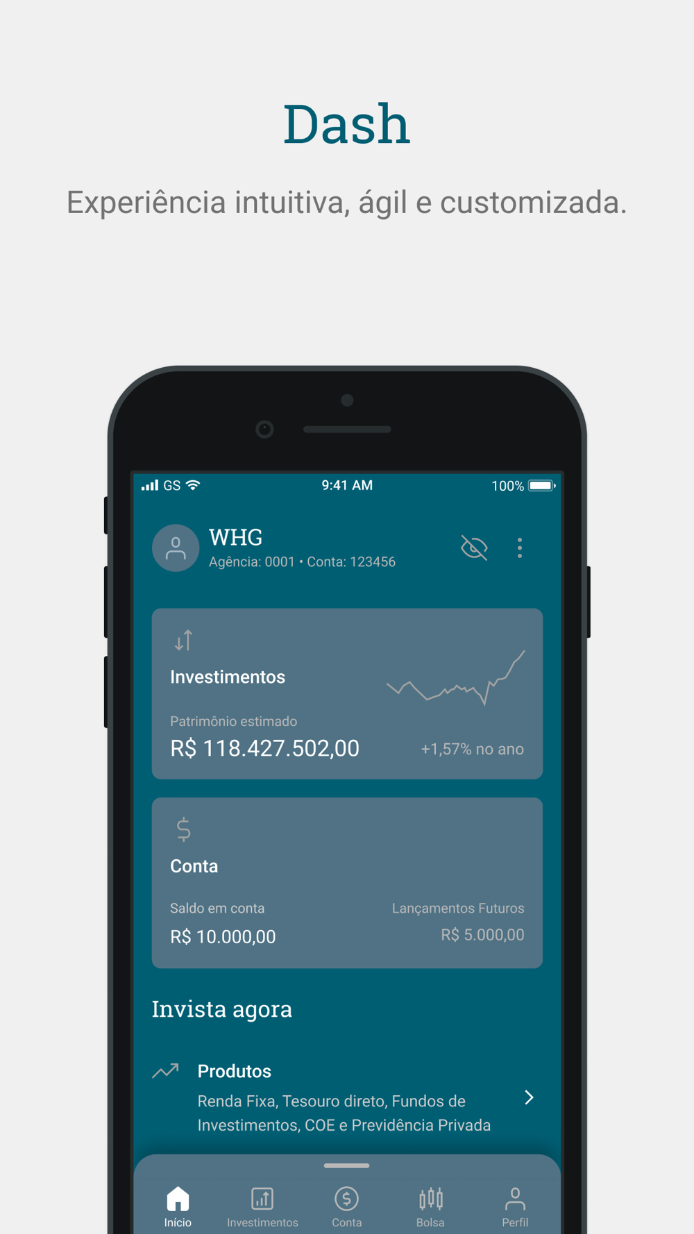 Em nosso aplicativo, você, cliente WHG, poderá organizar o que será exibido em sua home e selecionar as opções que mais interessam a você: investimentos, conta, renda fixa, renda variável e outras.