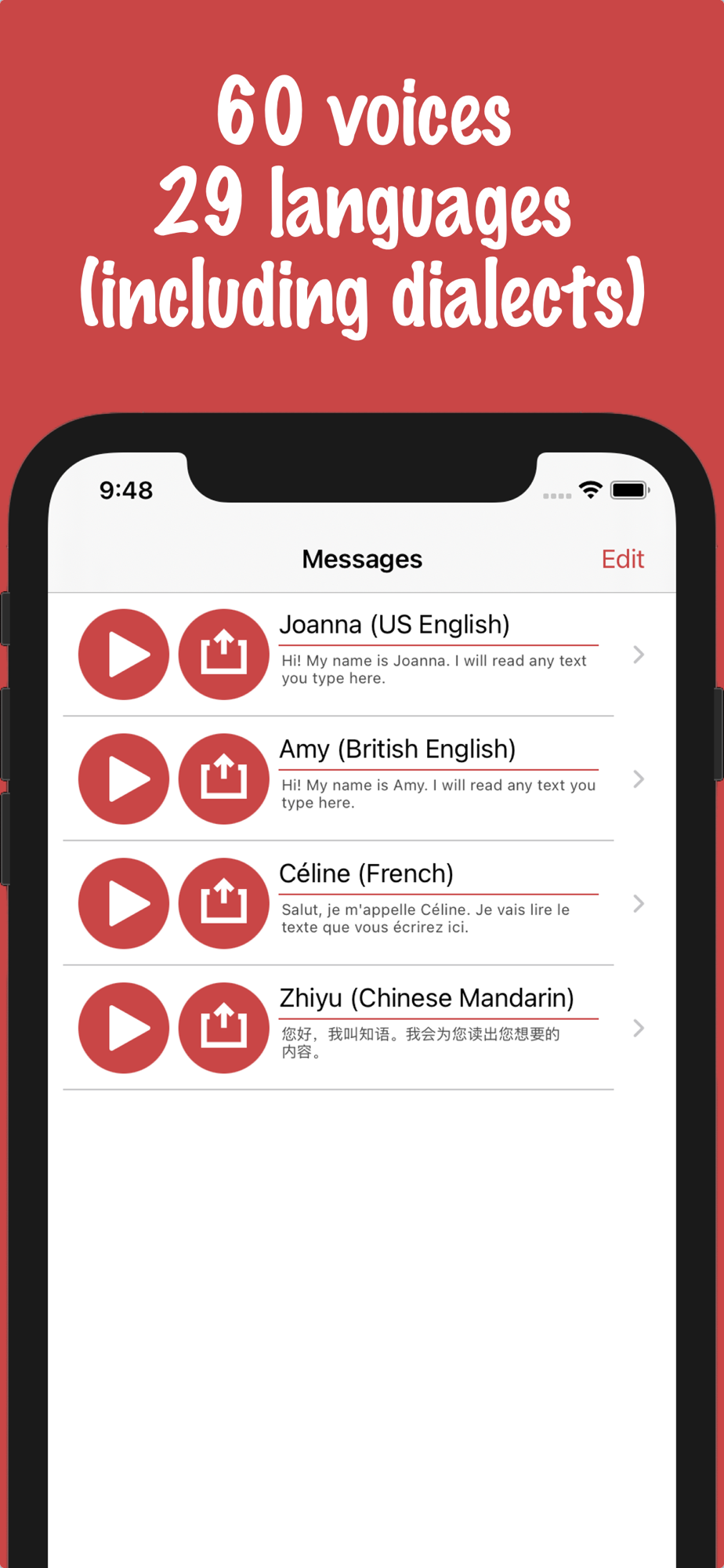Type in the text and the application will pronounce or whisper it in any of 60 voices in 29 languages (including dialects) with the appropriate accent!