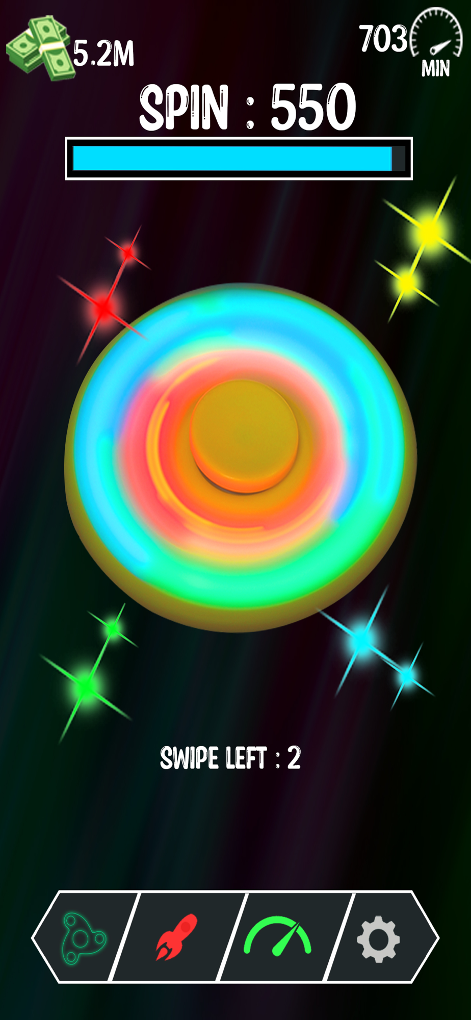 You have 5 swipes to create the best spin possible. Swipe your finger left or right on the spinner, wait for it to stop, and sweep the sweet rewards! Upgrade your finger spinner, challenge your friends, and break records!