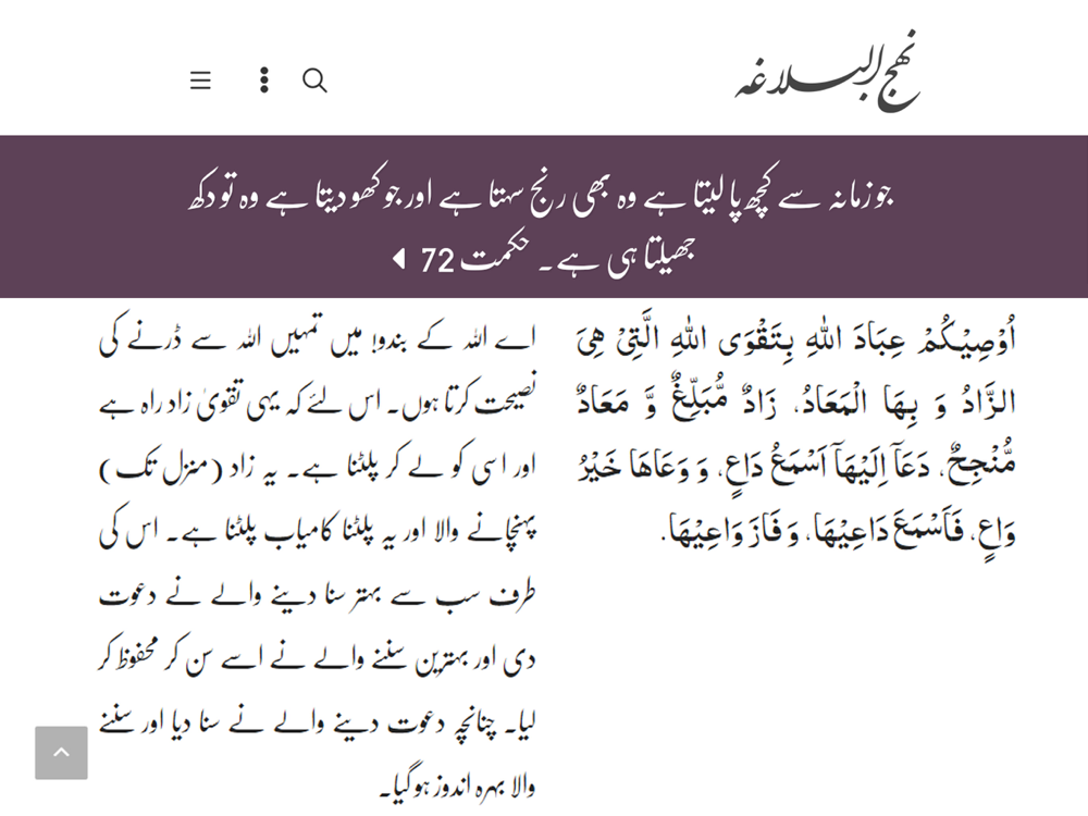 نہج البلاغہ، امیر المومنین امام علی علیہ السلام کے منتخب حکیمانہ خطبات، خطوط اور اقوال کا مجموعہ ہے جسے چوتھی صدی ہجری کے اواخر میں سید رضی قدس سرہٗ نے جمع و تدوین کیا۔ اس شہرہ آفاق کتاب کا اردو ترجمہ علامہ مفتی جعفر حسین اعلیٰ اللہ مقامہٗ نے کیا جسے برصغیر کے علاوہ عالمی سطح پر زبردست پذیرائی ملی۔ مرکز افکار اسلامی نے اس کو از سر نو مرتب کرکے شاندار انداز میں شائع کیا اور عصر جدید کے تقاضوں سے ہم آہنگ کرنے کے لیے اس نسخے کی ویب سائٹ اور موبائل ایپس کوثر انفارمیٹکس کے اشتراک سے پیش کی گئیں۔