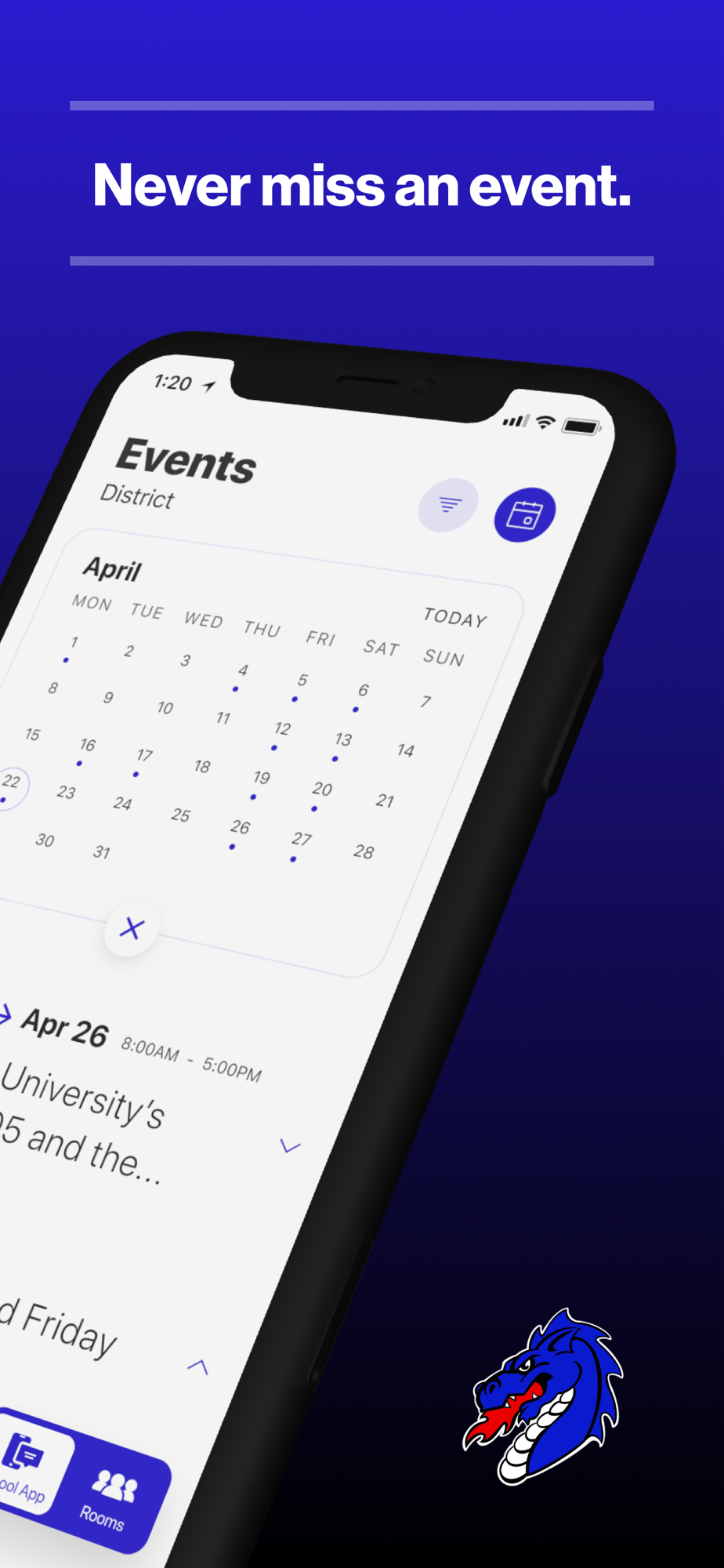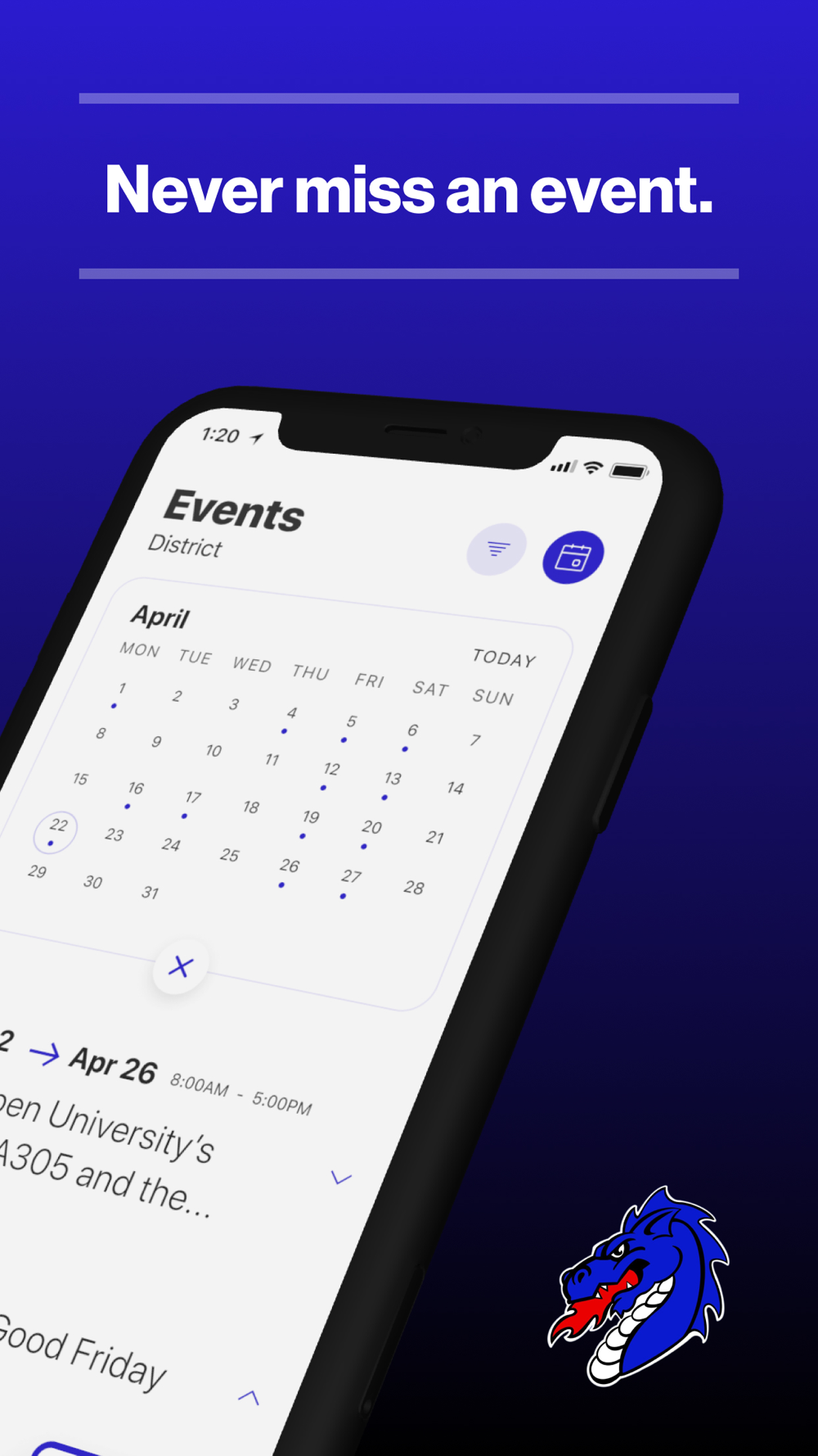 The event section shows a list of events throughout the district. Users can add an event to your calendar to share the event with friends and family with one tap.