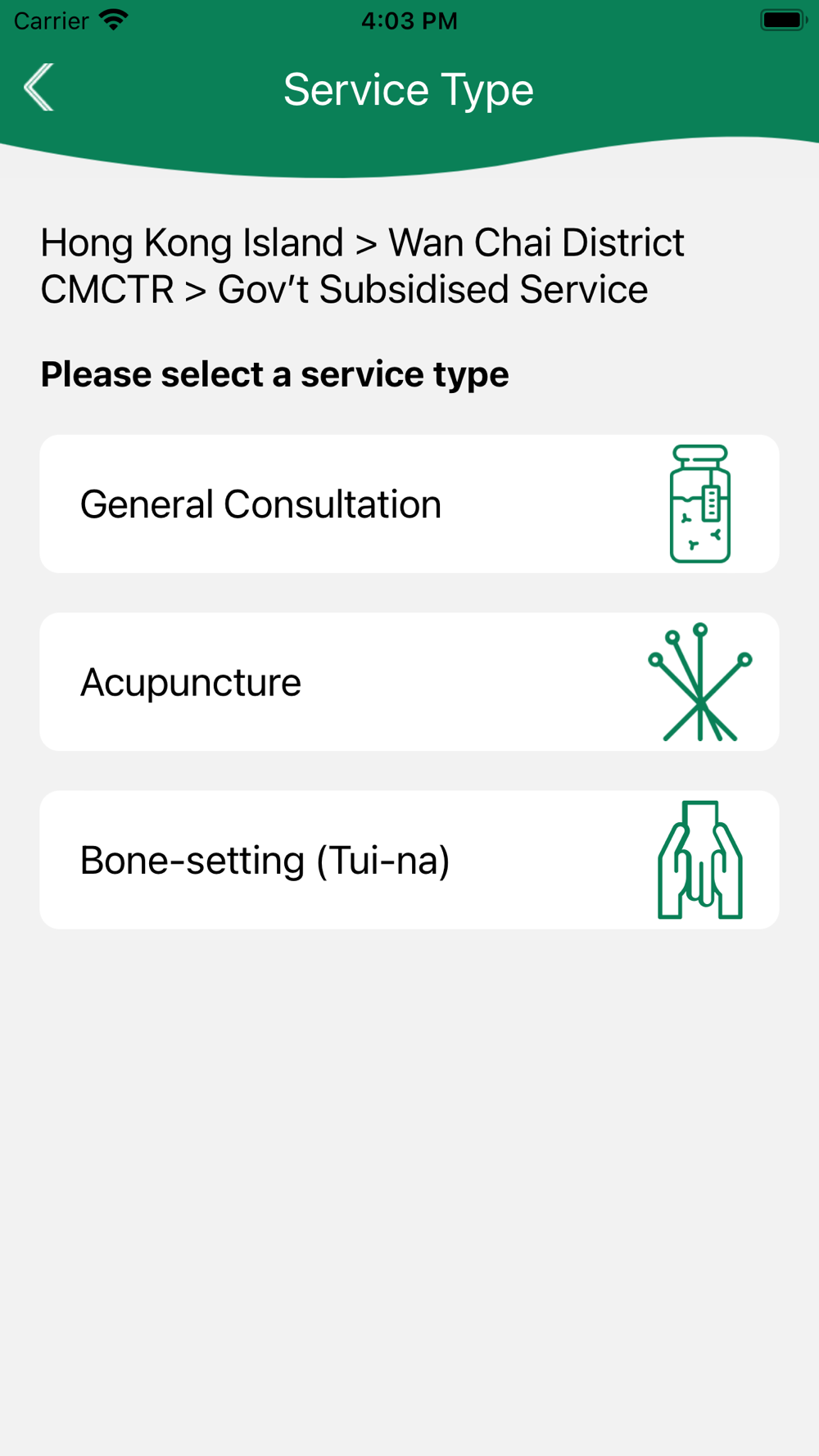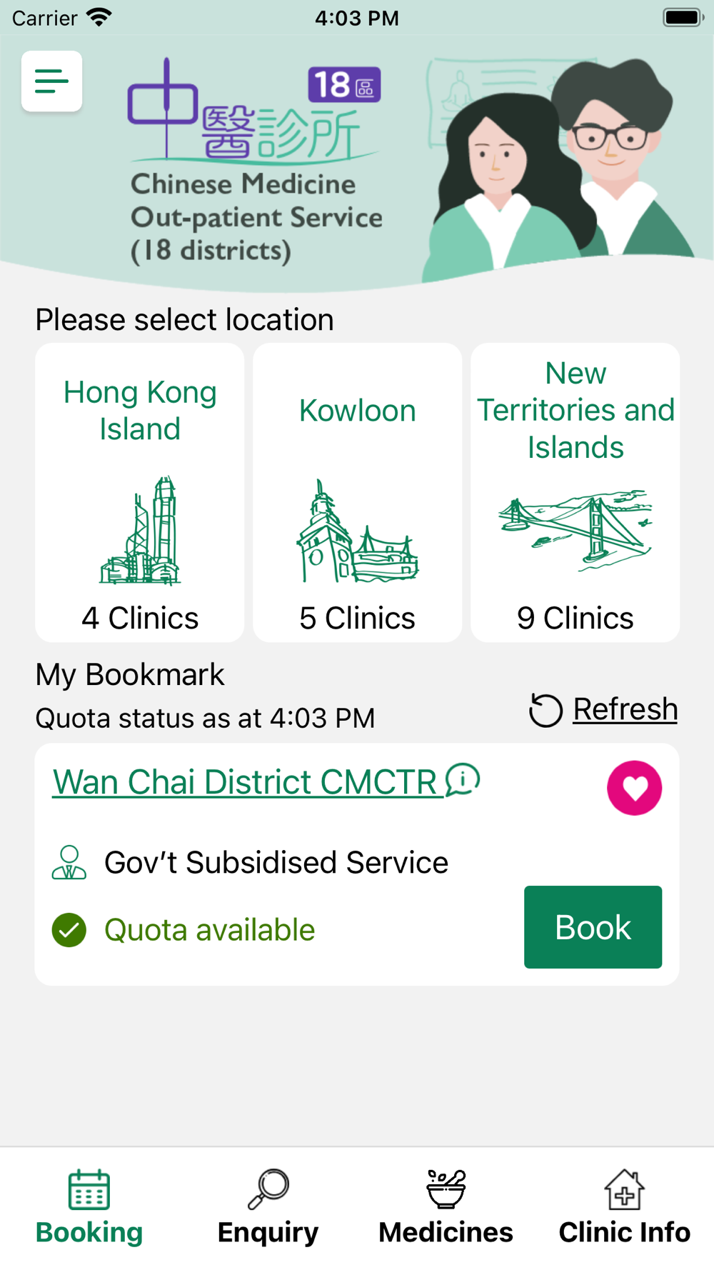 “18 CM Clinics” mobile application of Chinese Medicine Clinics cum Training and Research Centres provides platform for users to book episodic appointment for government subsidised out-patient Chinese Medicine service/ “Special CM Out-patient Programme for COVID-19 infected persons” (first appointment), anytime and anywhere. With intuitive functions of the app, patients can manage booking arrangement effectively, access real-time collection status of medicines as well as information of each Chinese Medicine Clinics cum Training and Research Centres for public enquiries.