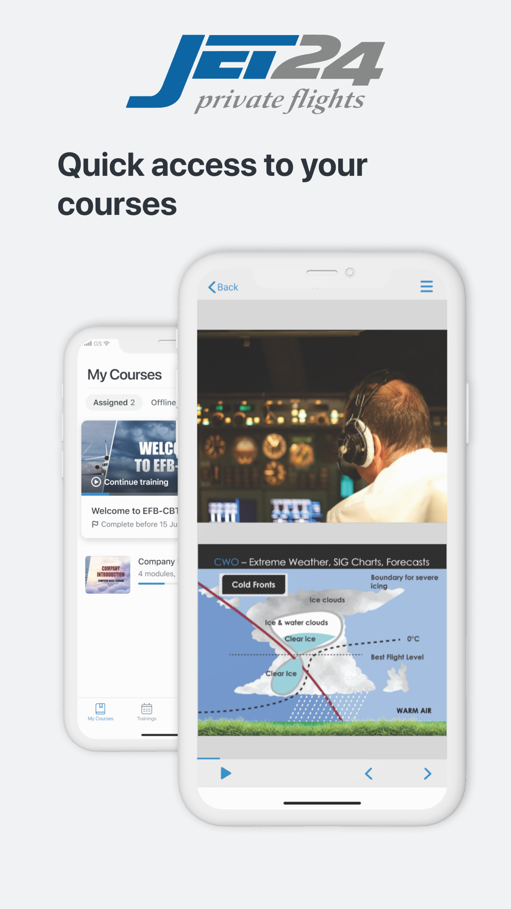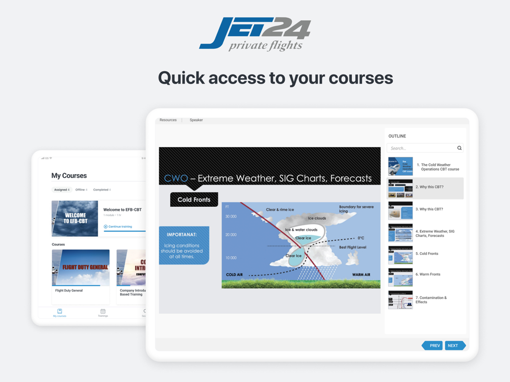 Jet24 is an easy-to-use hosted Learning Management System (LMS) for Flight Crew. The training platform is a combined product of technology and aviation experts all aimed to provide one high-end quality training infrastructure to assist companies with their training demands.