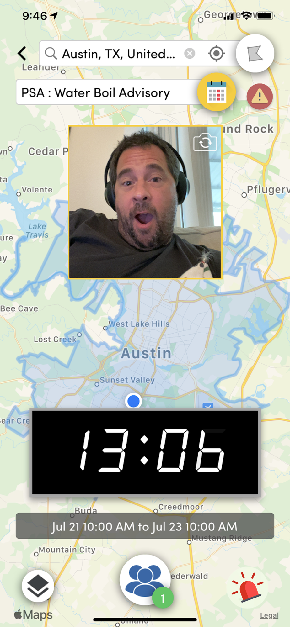 With a tap of the ALERT siren, city/state/federal officials can reach out to audiences in real-time with a personal broadcast/livestream. Hosts/organizers can create a call-to-action to accompany the ALERT - asking anyone within a designated geographic area, or a smaller area within, to contribute specific photos/videos which the Host requests. An ALERT can either be pre-recorded or streamed live. Pre-sets allow officials to quickly alert anyone in their city, their state, the country or the world; with a little extra preparation, each of the BRONZE, SILVER, GOLD and PLATINUM subscription levels also allow a Host to invite up to eight (8) individuals to livestream along with them but with the added granularity of being able to set the target area down to the space of a fire-hydrant.