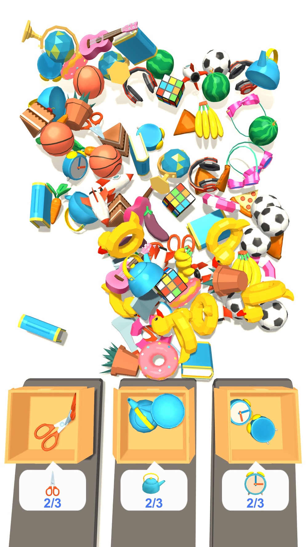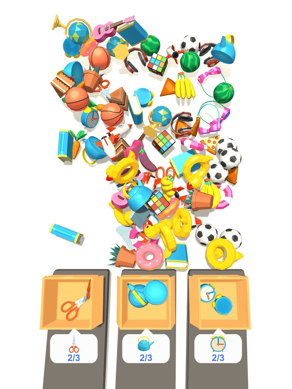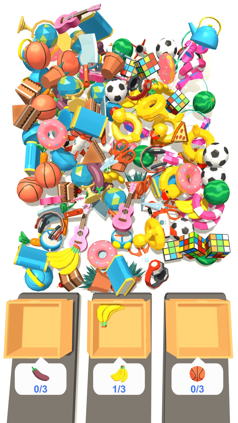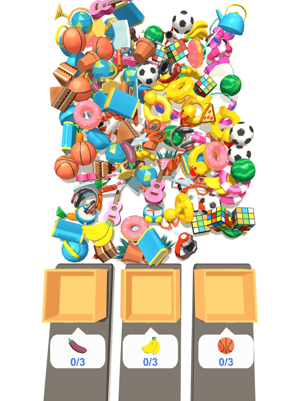 · Just tap to place the 3D objects into the box. Two same objects will be collected.