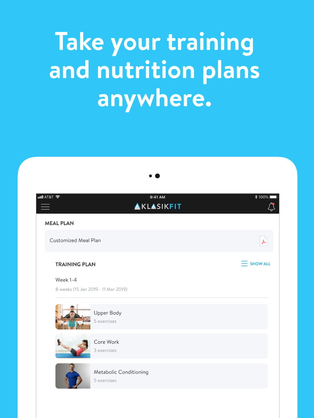 With the Klasik Fit App, you can start tracking your workouts and meals, measuring results, and achieving your fitness goals, all with the help of your personal trainer.